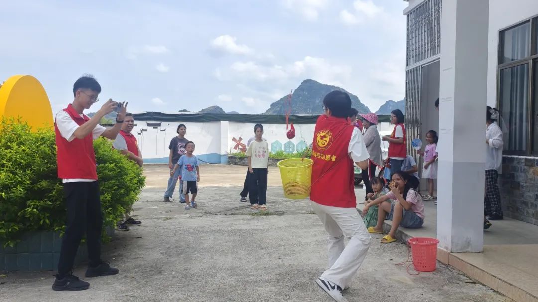 8月14日上午,龙头镇旗山村民委的院内欢声如沸。一只只五彩斑斓的绣球在空中划出优美弧线,传递着孩子们的清脆笑声与大学生志愿者的青春目光。一场主题为“青春‘乡’约‘童’心结,绣球共递新风尚”的“文明暖心”新时代文明实践暑期公益活动在旗山村的莲风梨韵中展开,龙头镇联合广西警察学院的大学生志愿者与20余名旗山村青少年儿童共同编织起一场文化传承与文明新风的夏日交响。