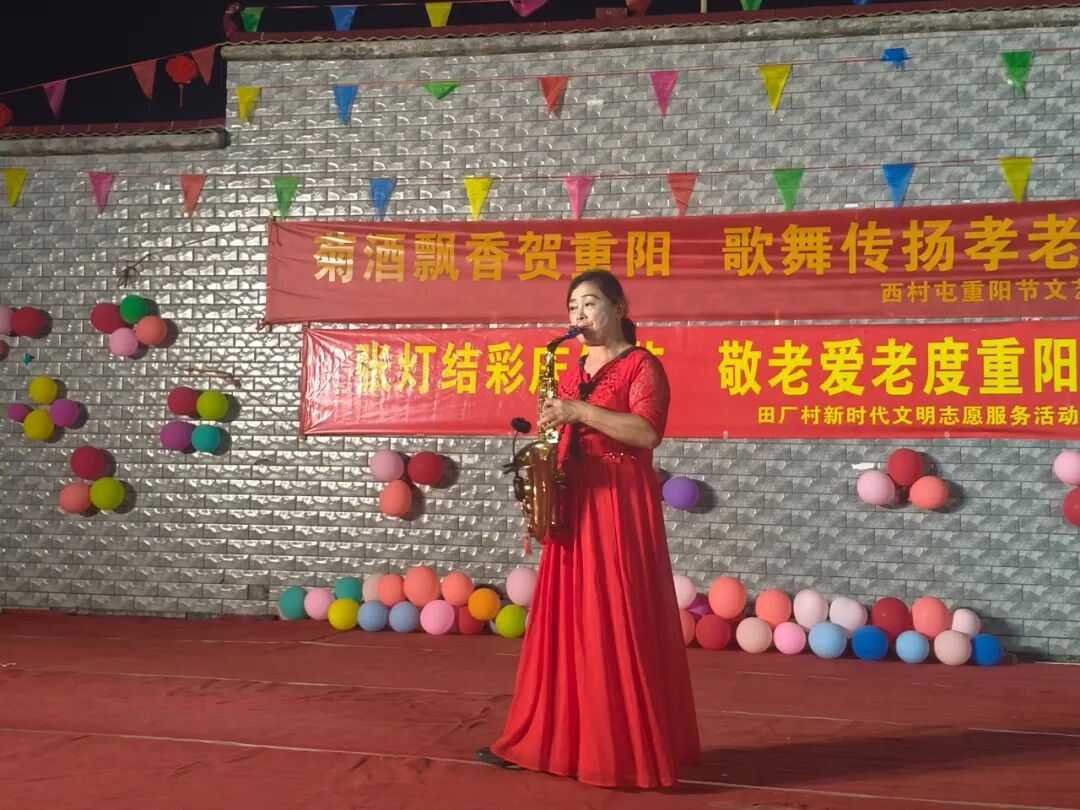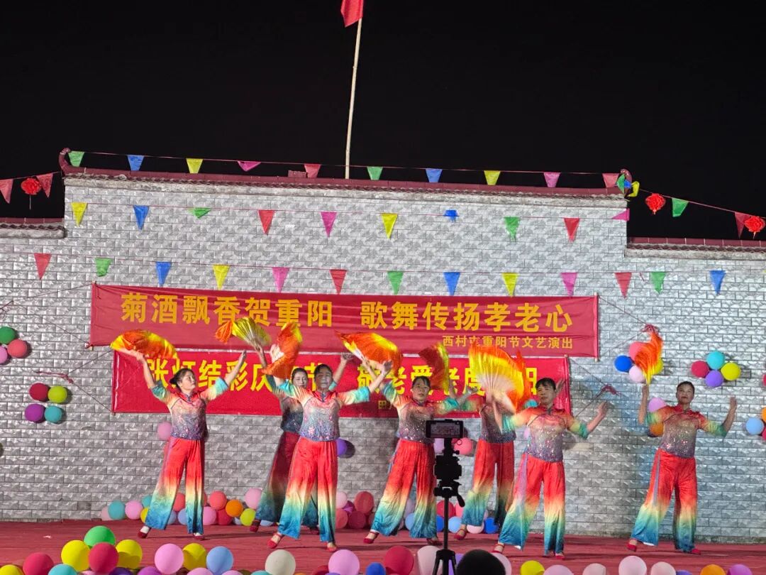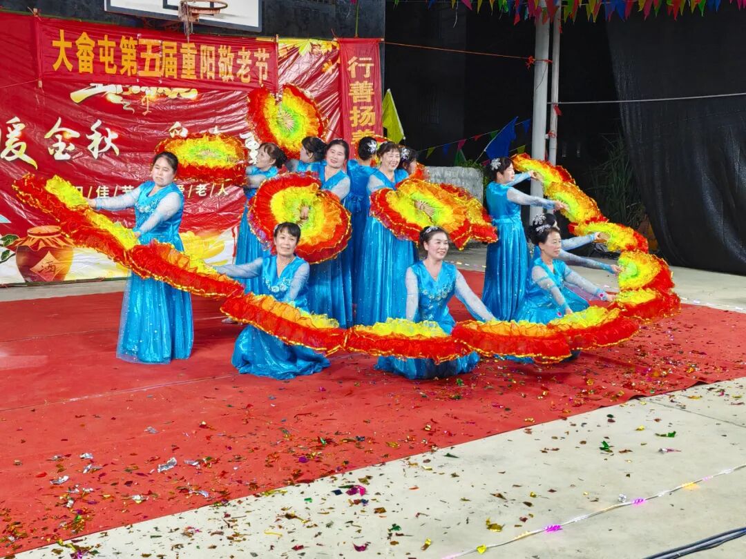 文艺汇演展风采,孝老爱亲氛围浓。各村屯的文艺演出现场热闹非凡。舞台上,演员们身着绚丽服饰,带来了极具特色的民族舞蹈,鼓手们节奏铿锵的鼓点、舞者们灵动的身姿,瞬间点燃现场气氛;还有充满活力的扇舞表演,彩扇翻飞间尽显对老人的美好祝愿;萨克斯独奏旋律悠扬,为活动增添了艺术气息。大畲屯的文艺演出更是精彩纷呈,舞蹈演员们手持金色花球,用欢快的舞步传递着节日的喜悦;扇舞表演中,演员们以扇为媒,编织出一个个精美的造型,将现场氛围推向高潮。这些文艺节目不仅展现了村民们的才艺与风采,更传递出对老人的敬爱之情,让孝老爱亲的氛围在各村屯弥漫。