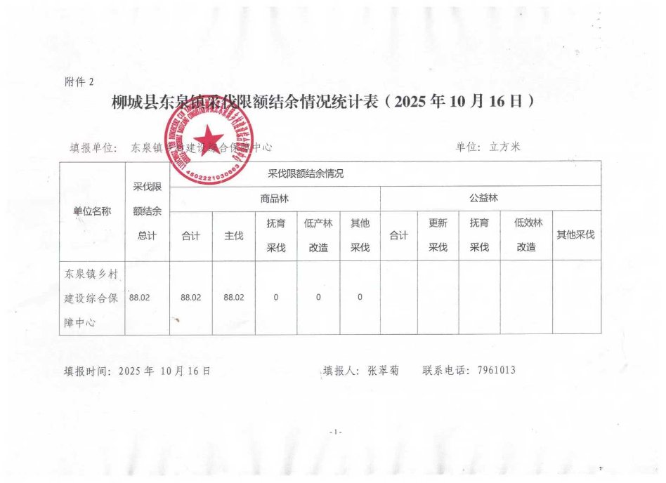 柳城县东泉镇采伐限额结余情况统计表(2025年10月16日)