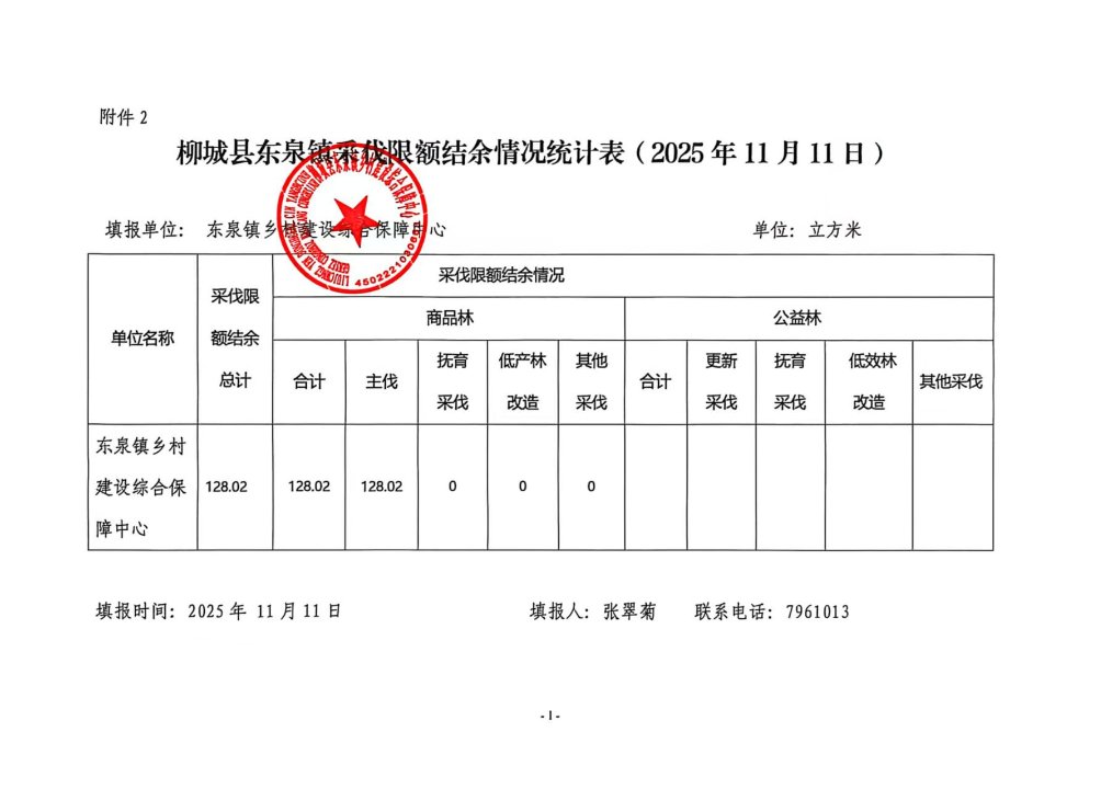 柳城县东泉镇采伐限额结余情况统计表(2025年11月11日)