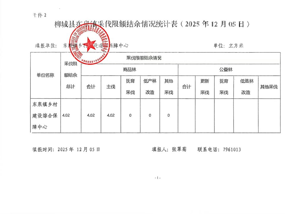 柳城县东泉镇采伐限额结余情况统计表(2025年12月5日)