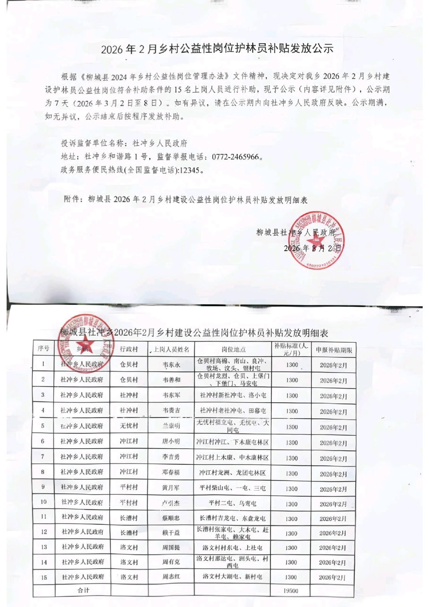 社冲乡2026年2月乡村公益性岗位护林员补贴发放公示