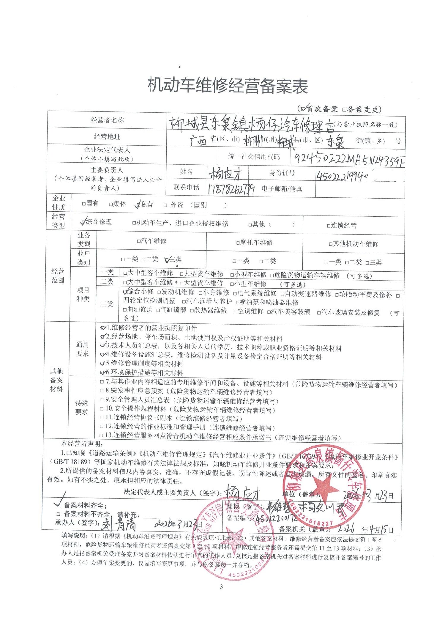 柳城县东泉镇杨仔汽车修理店机动车维修经营备案表