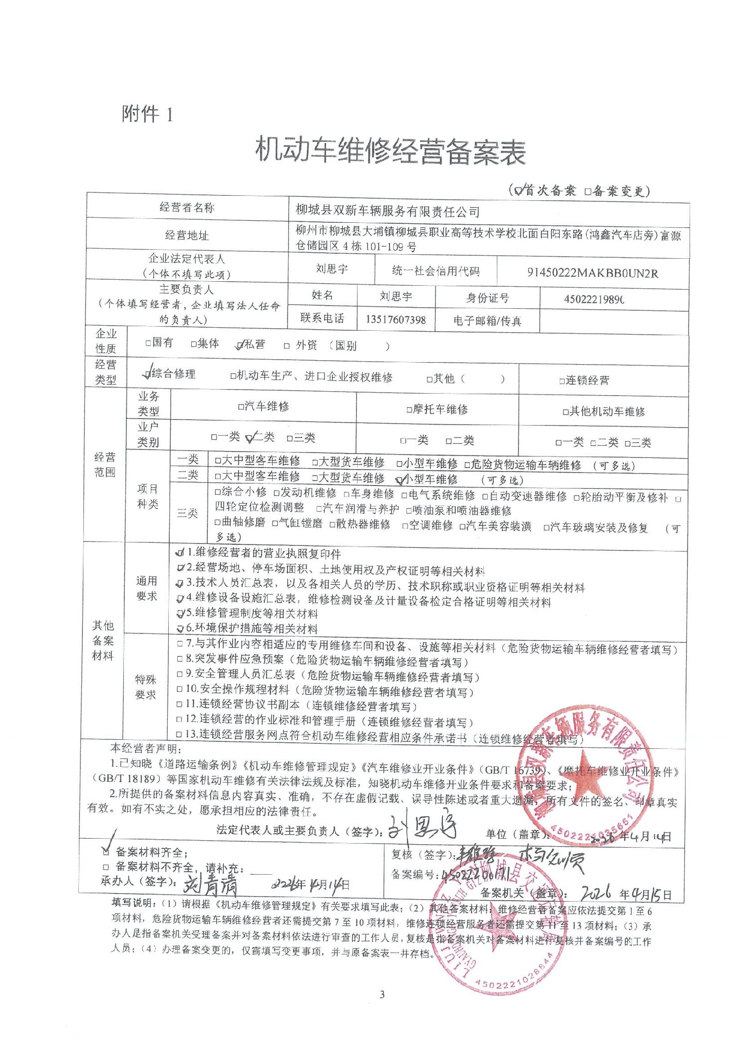 柳城县双新车辆服务有限责任公司机动车维修经营备案表