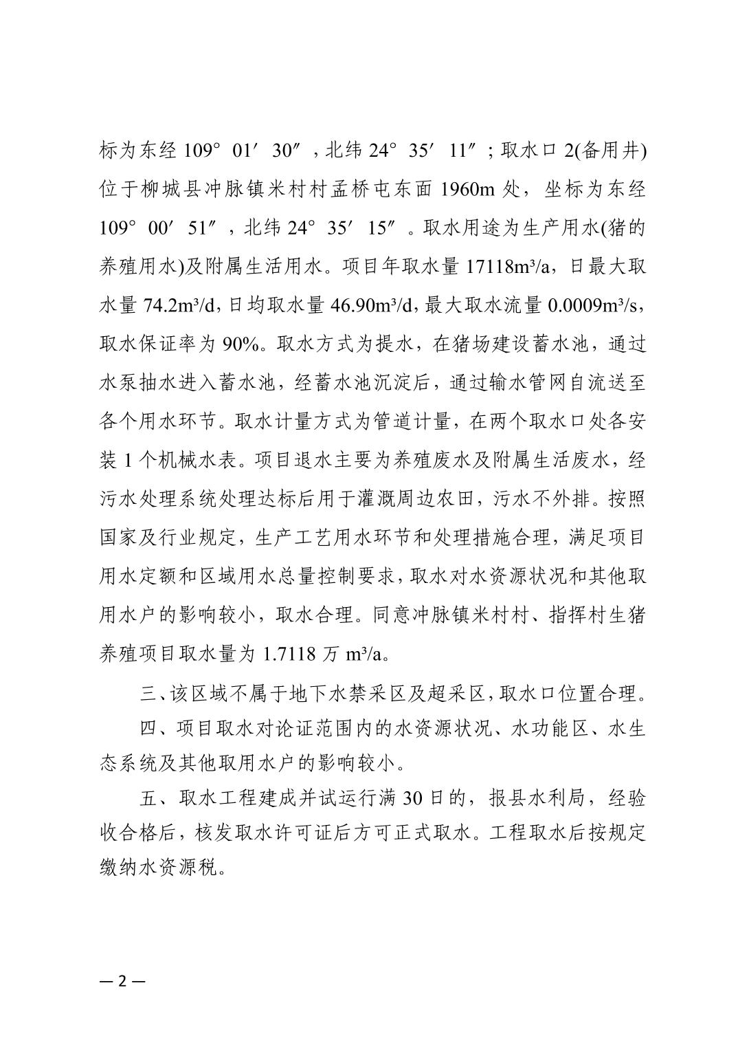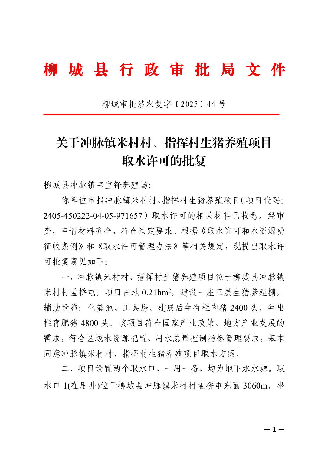 关于冲脉镇米村村、指挥村生猪养殖项目取水许可的批复