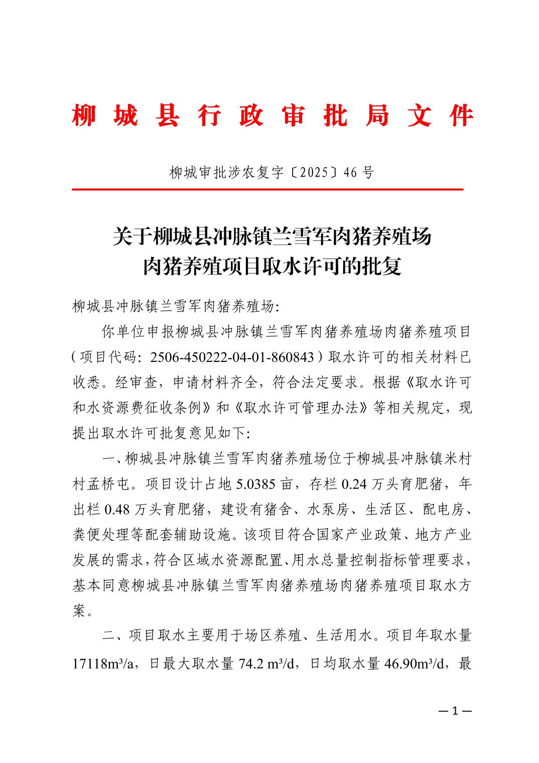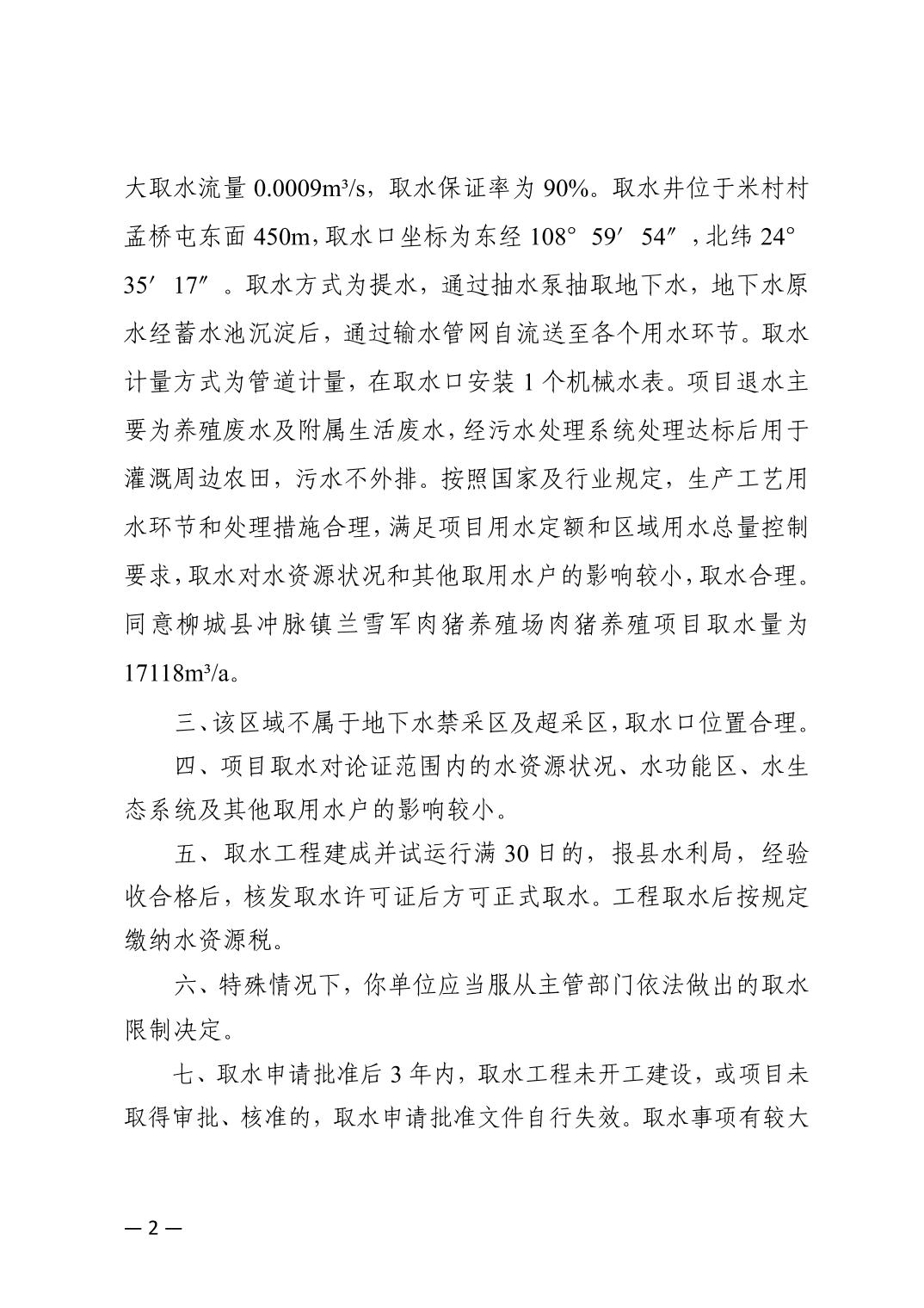关于柳城县冲脉镇兰雪军肉猪养殖场肉猪养殖项目取水许可的批复