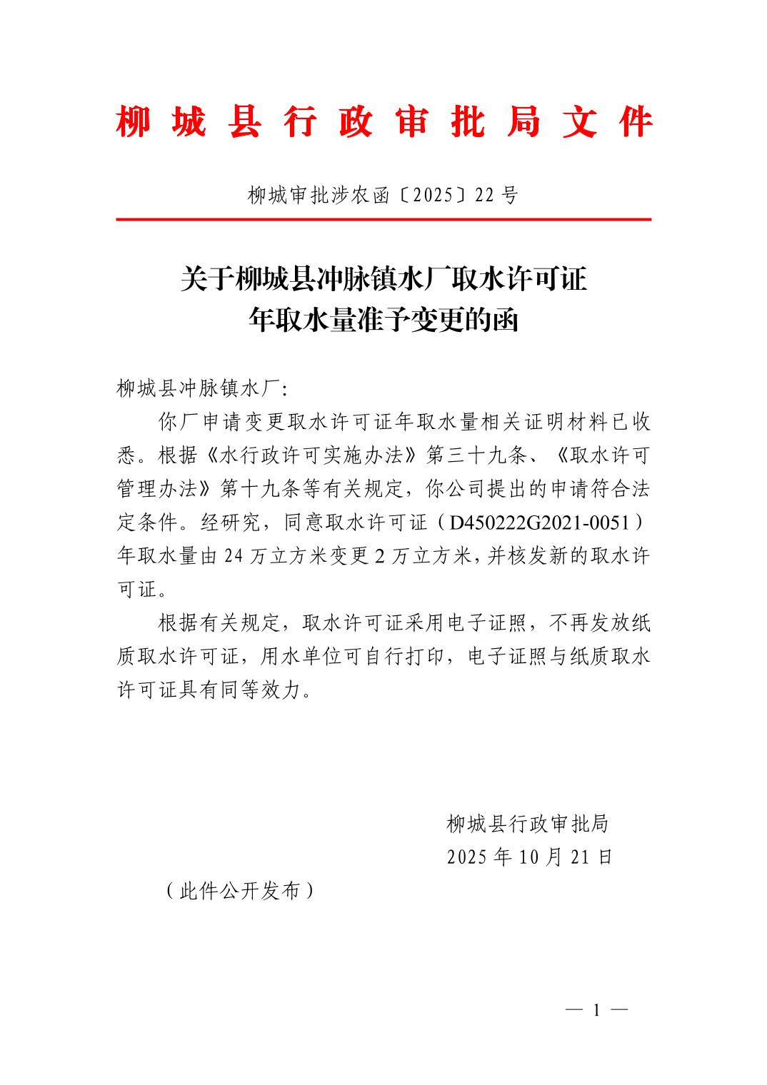 关于柳城县冲脉镇水厂取水许可证年取水量准予变更的函