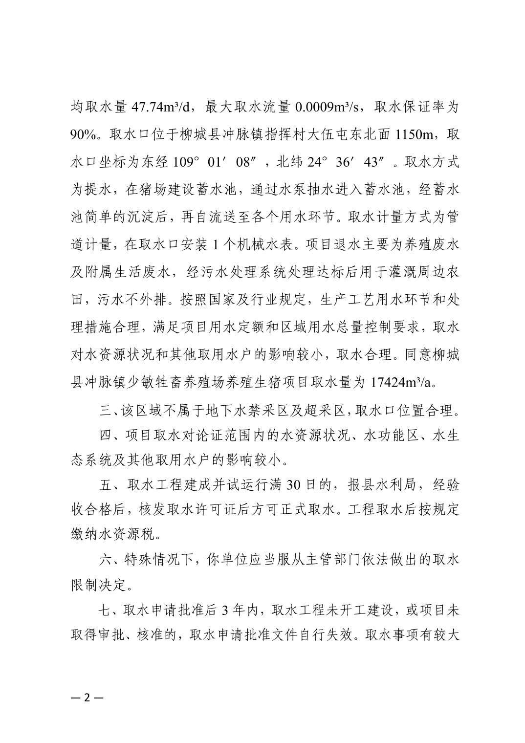 关于柳城县冲脉镇少敏牲畜养殖场养殖生猪项目取水许可的批复