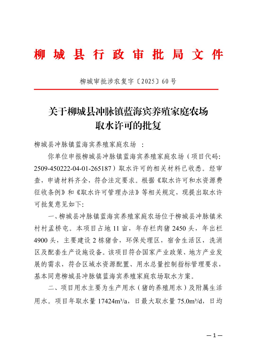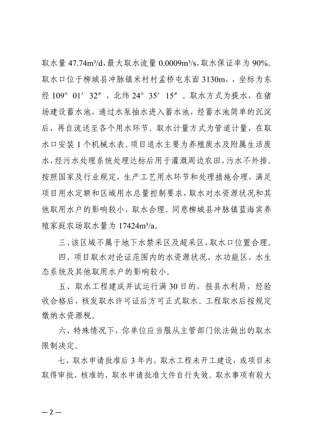 关于柳城县冲脉镇蓝海宾养殖家庭农场取水许可的批复