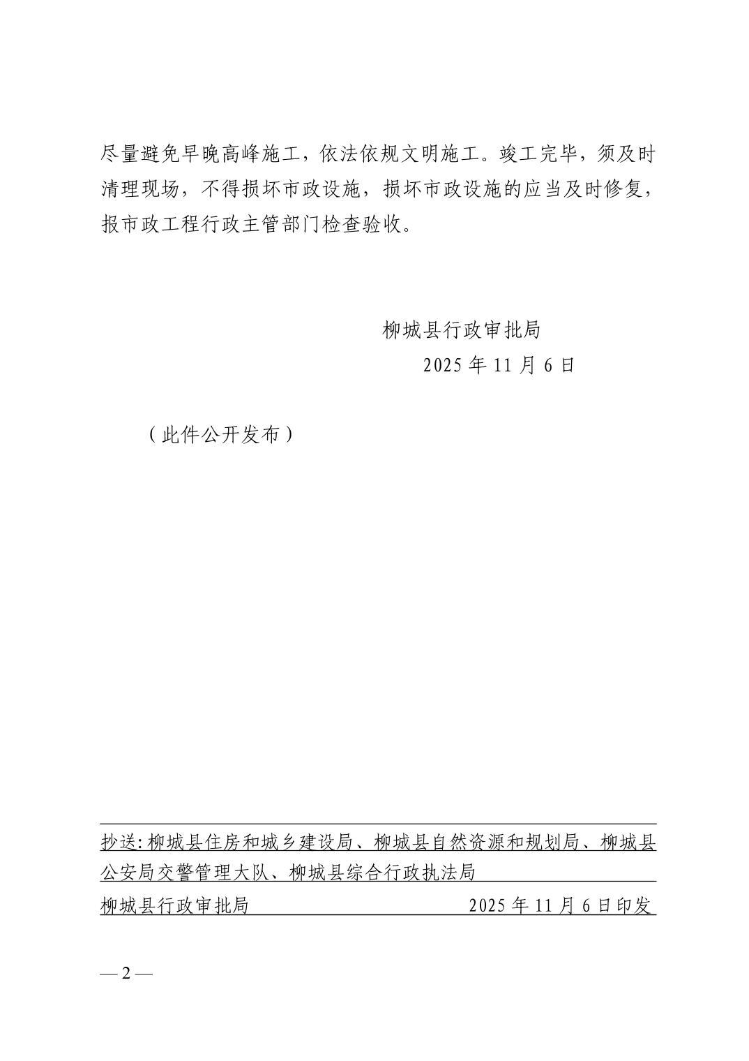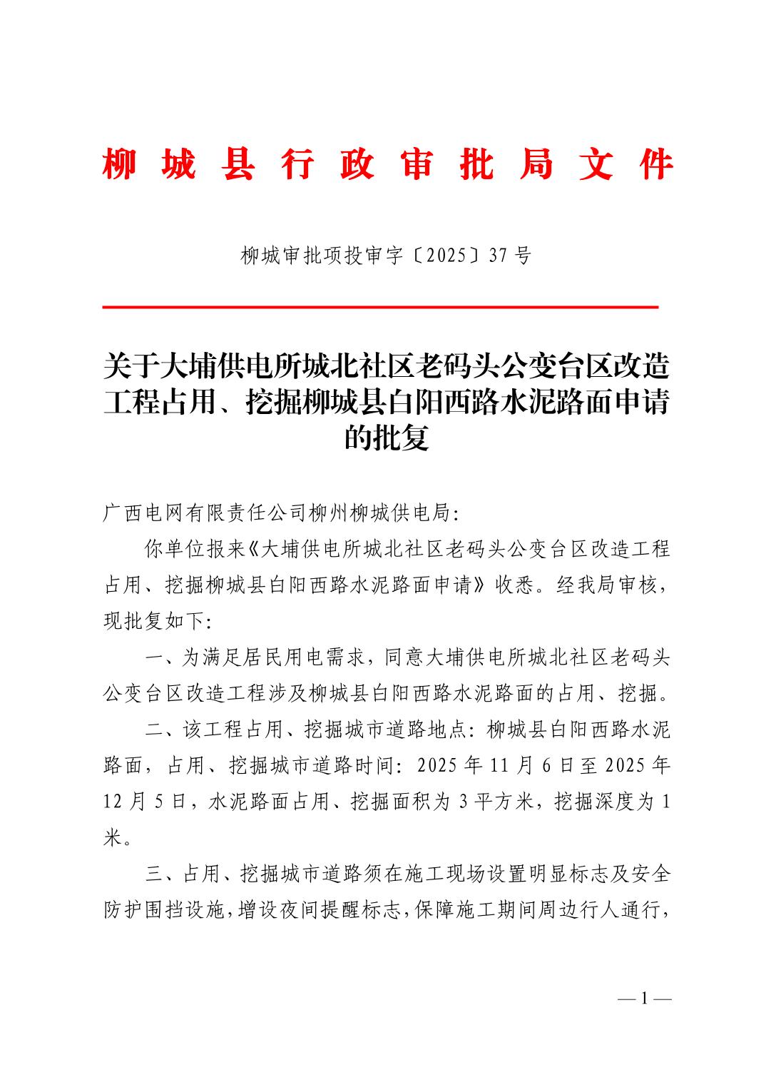 关于大埔供电所城北社区老码头公变台区改造工程占用、挖掘柳城县白阳西路水泥路面申请的批复