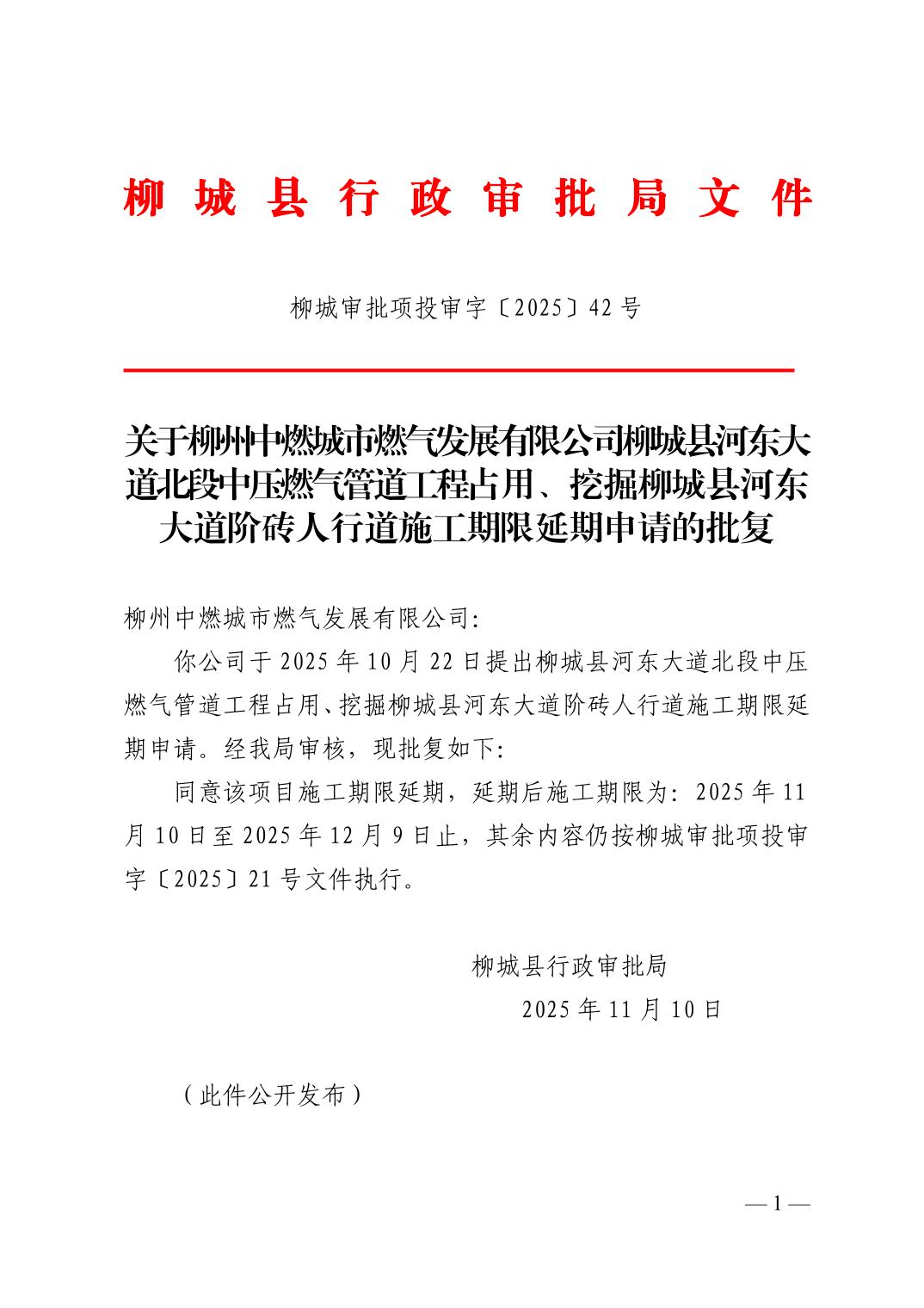 关于柳州中燃城市燃气发展有限公司柳城县河东大道北段中压燃气管道工程占用、挖掘柳城县河东大道阶砖人行道施工期限延期申请的批复
