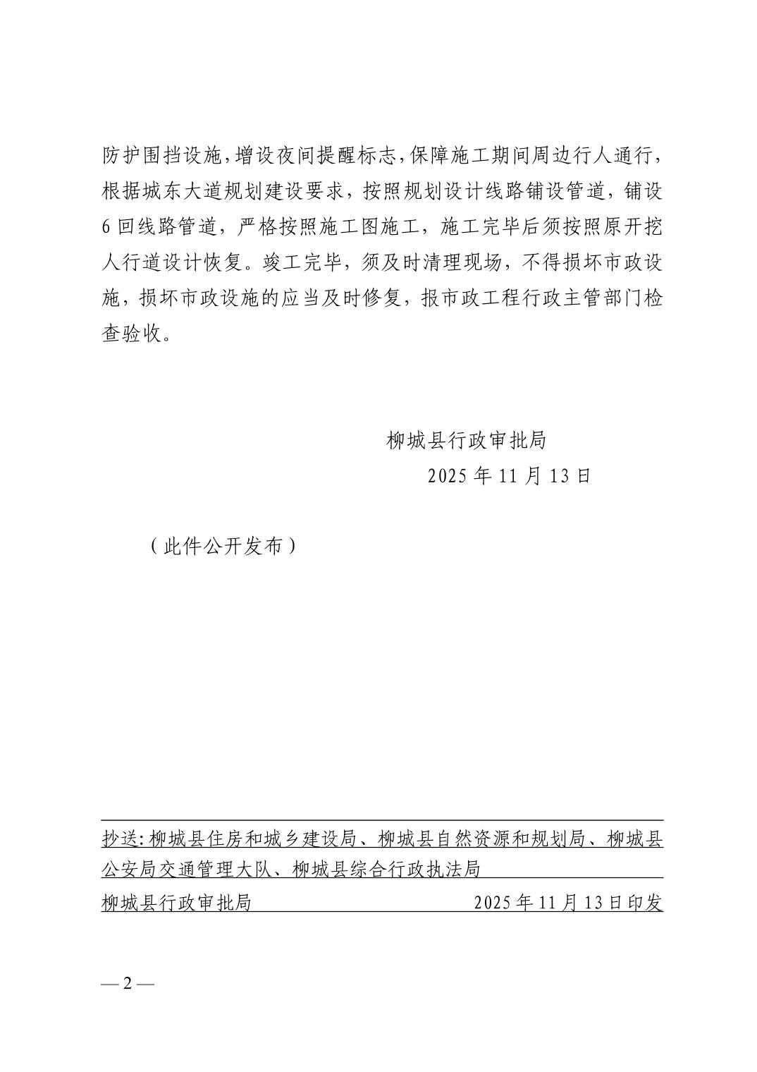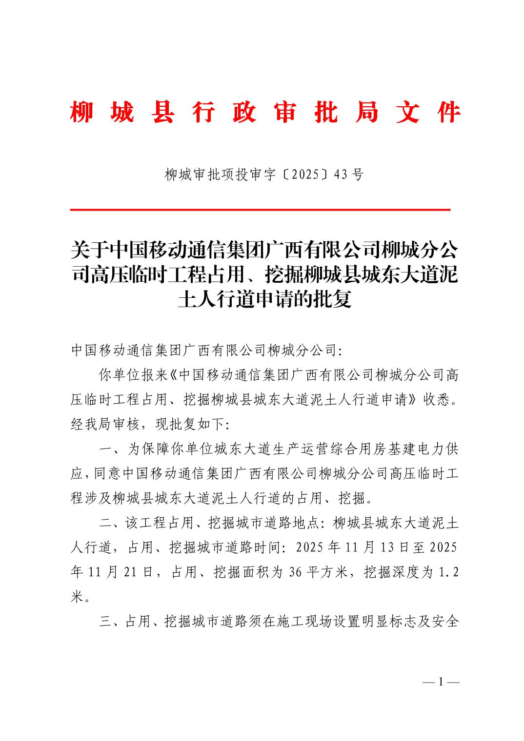 关于中国移动通信集团广西有限公司柳城分公司高压临时工程占用、挖掘柳城县城东大道泥土人行道申请的批复