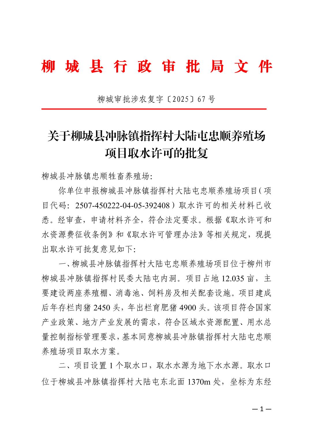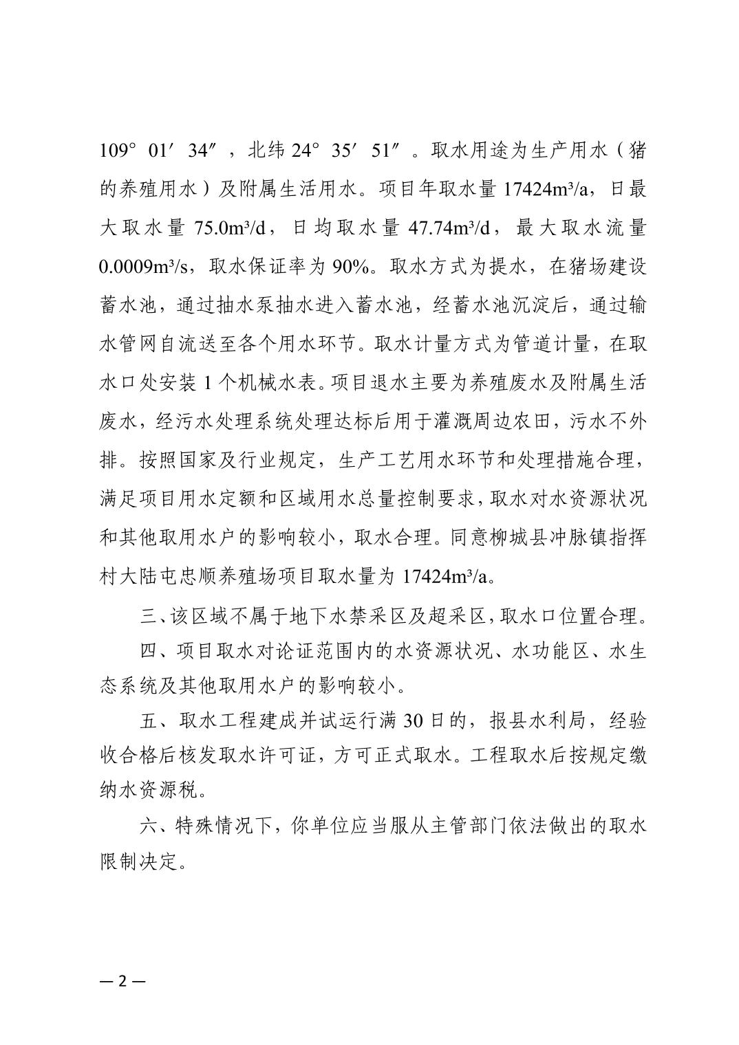 关于柳城县冲脉镇指挥村大陆屯忠顺养殖场项目的取水批复