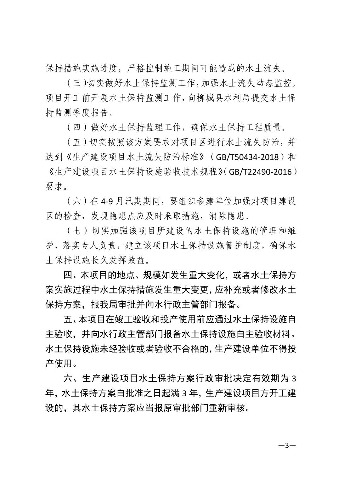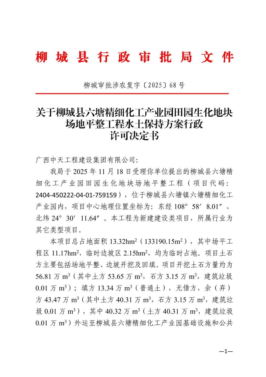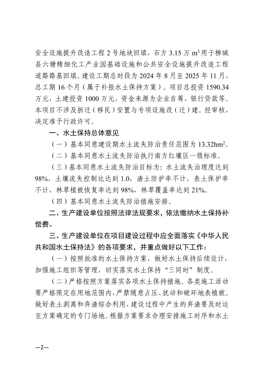 关于柳城县六塘精细化工产业园田园生化地块场地平整工程水土保持方案行政许可决定书