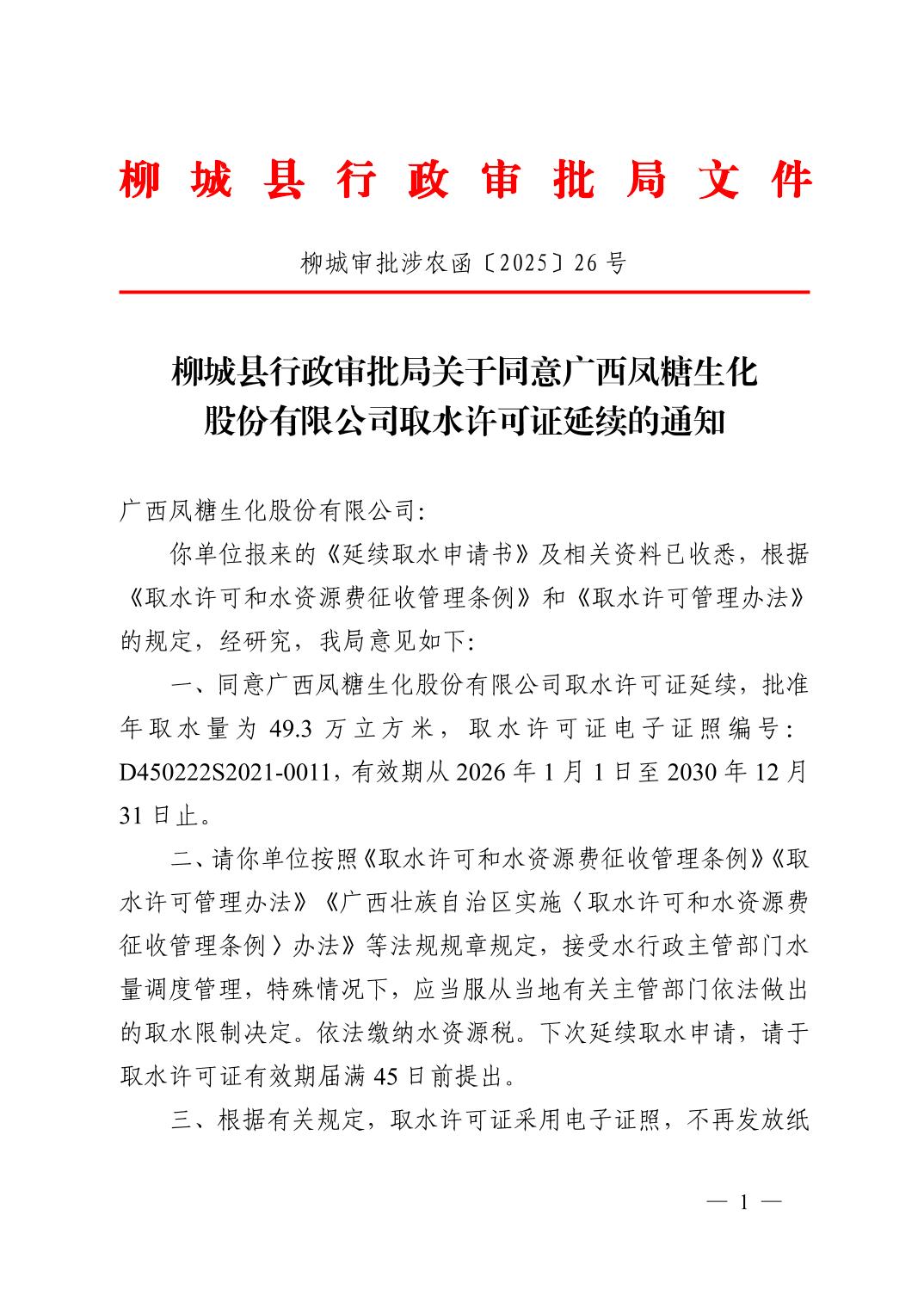柳城县行政审批局关于同意广西凤糖生化股份有限公司取水许可证延续的通知