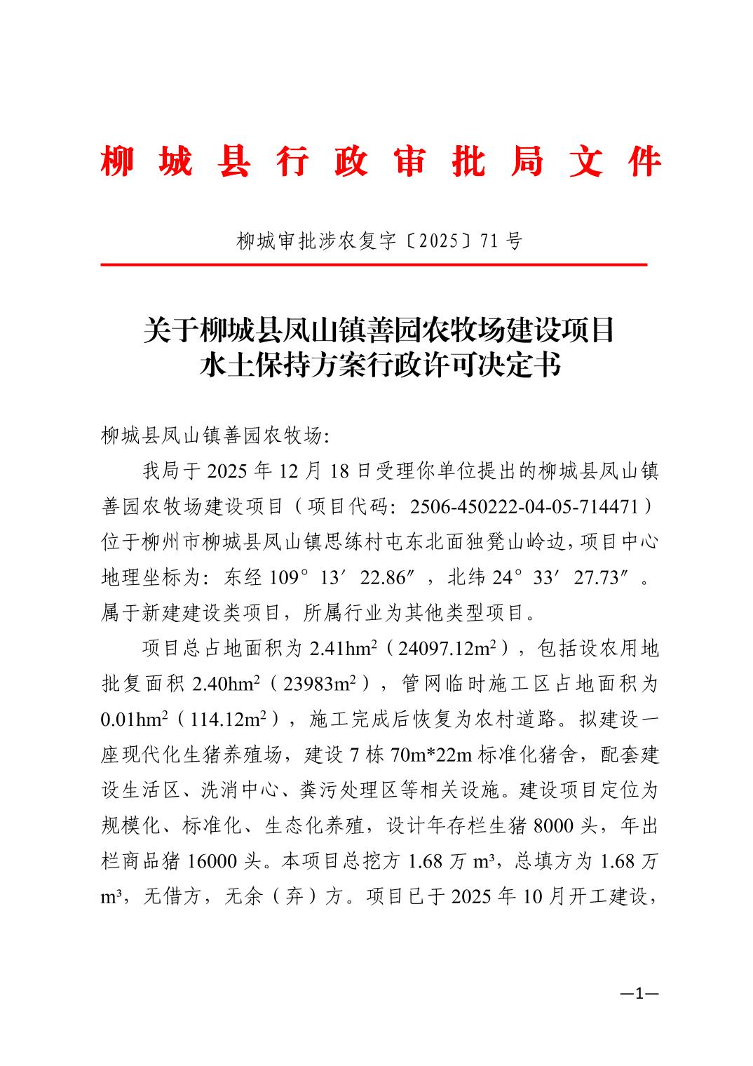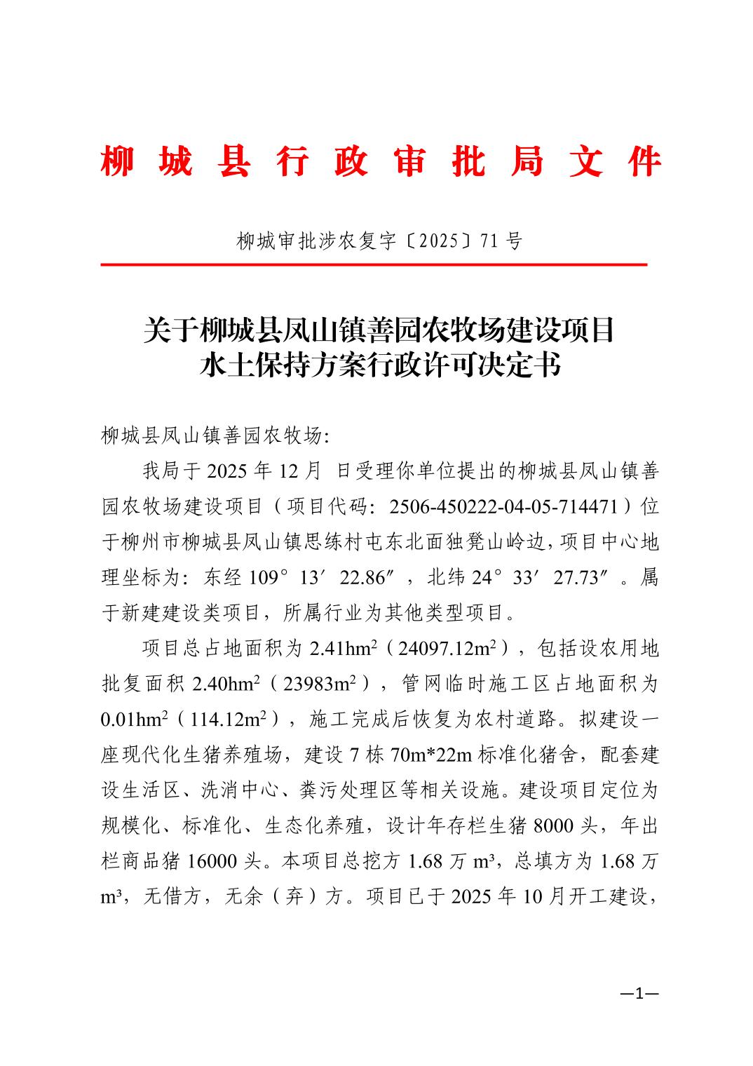 关于柳城县凤山镇善园农牧场建设项目水土保持方案行政许可决定书