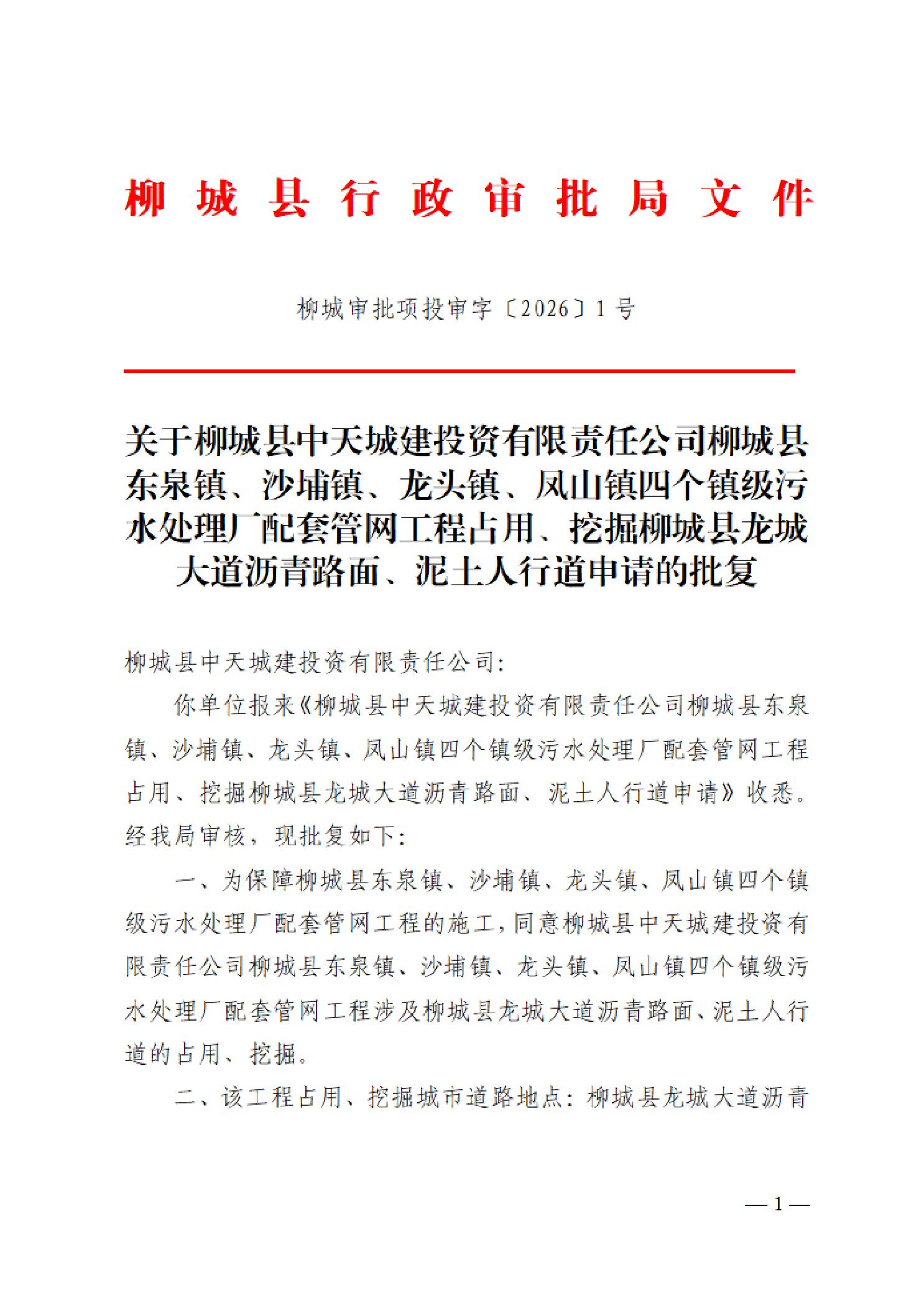 柳城审批项投审字〔2026〕1号关于柳城县中天城建投资有限责任公司柳城县东泉镇、沙埔镇、龙头镇、凤山镇四个镇级污水处理厂配套管网工程占用、挖掘柳城县龙城大道沥青路面、泥土人行道申请的批复