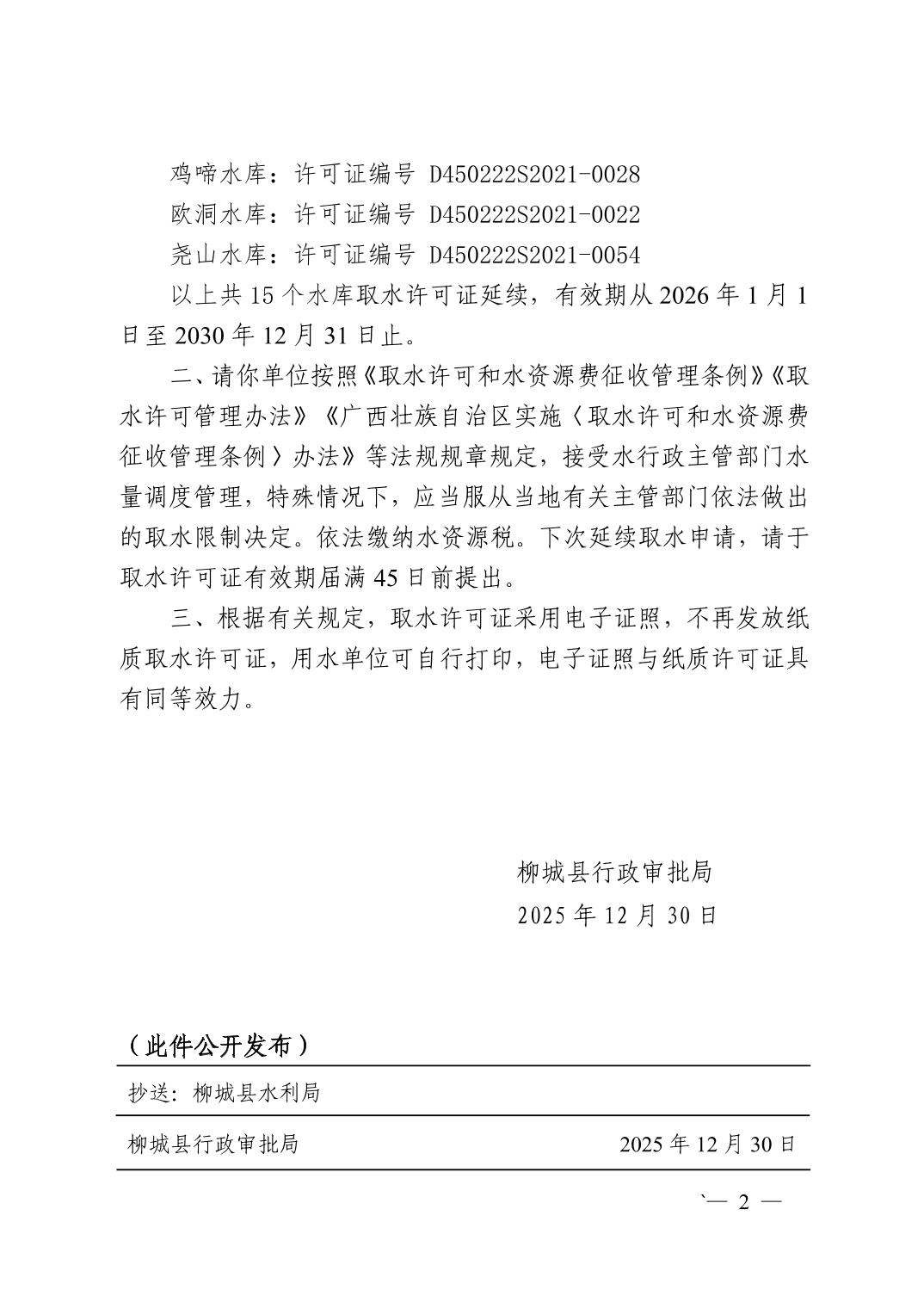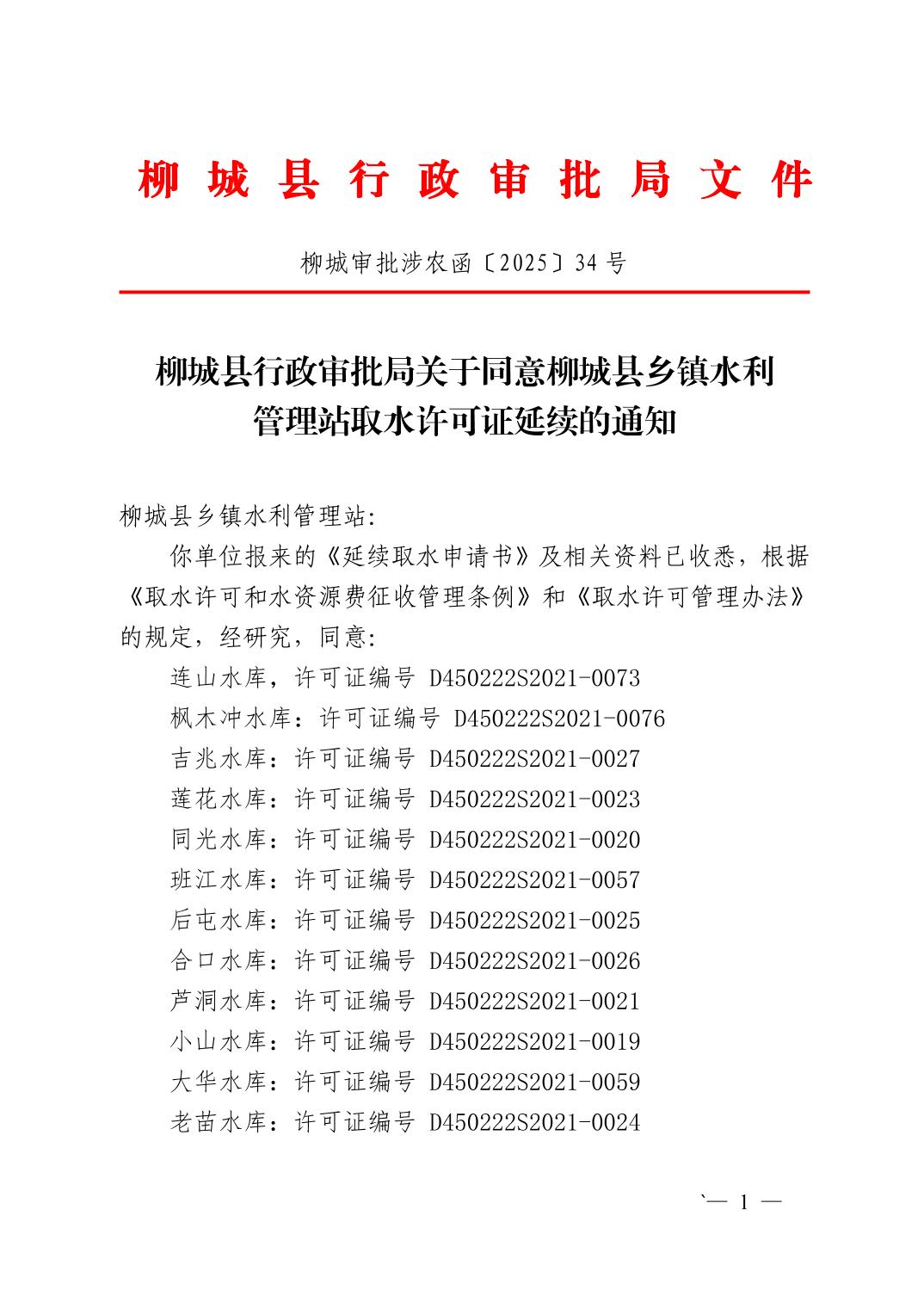 柳城县行政审批局关于同意柳城县乡镇水利管理站十五个水库取水许可证延续的通知