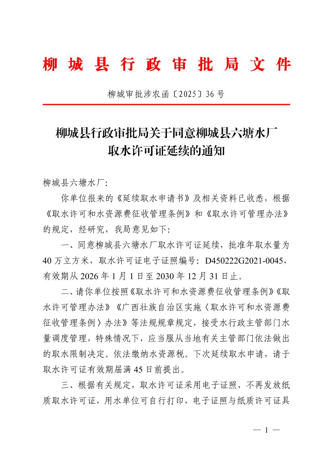 柳城县行政审批局关于同意柳城县六塘水厂取水许可证延续的通知