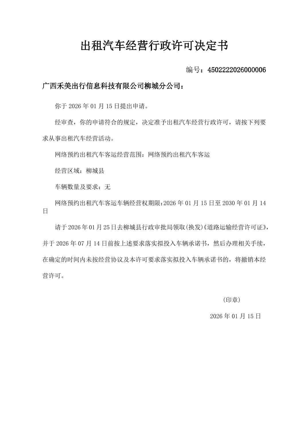 2026年1月15日柳城县行政审批局关于出租汽车经营行政许可决定书
