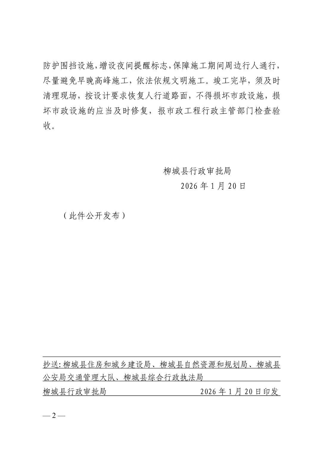 柳城审批项投审字〔2026〕4号关于柳州市柳城县嘉泰运输有限公司10KV业扩配套项目工程占用、挖掘柳城县白阳北路彩砖人行道申请的批复