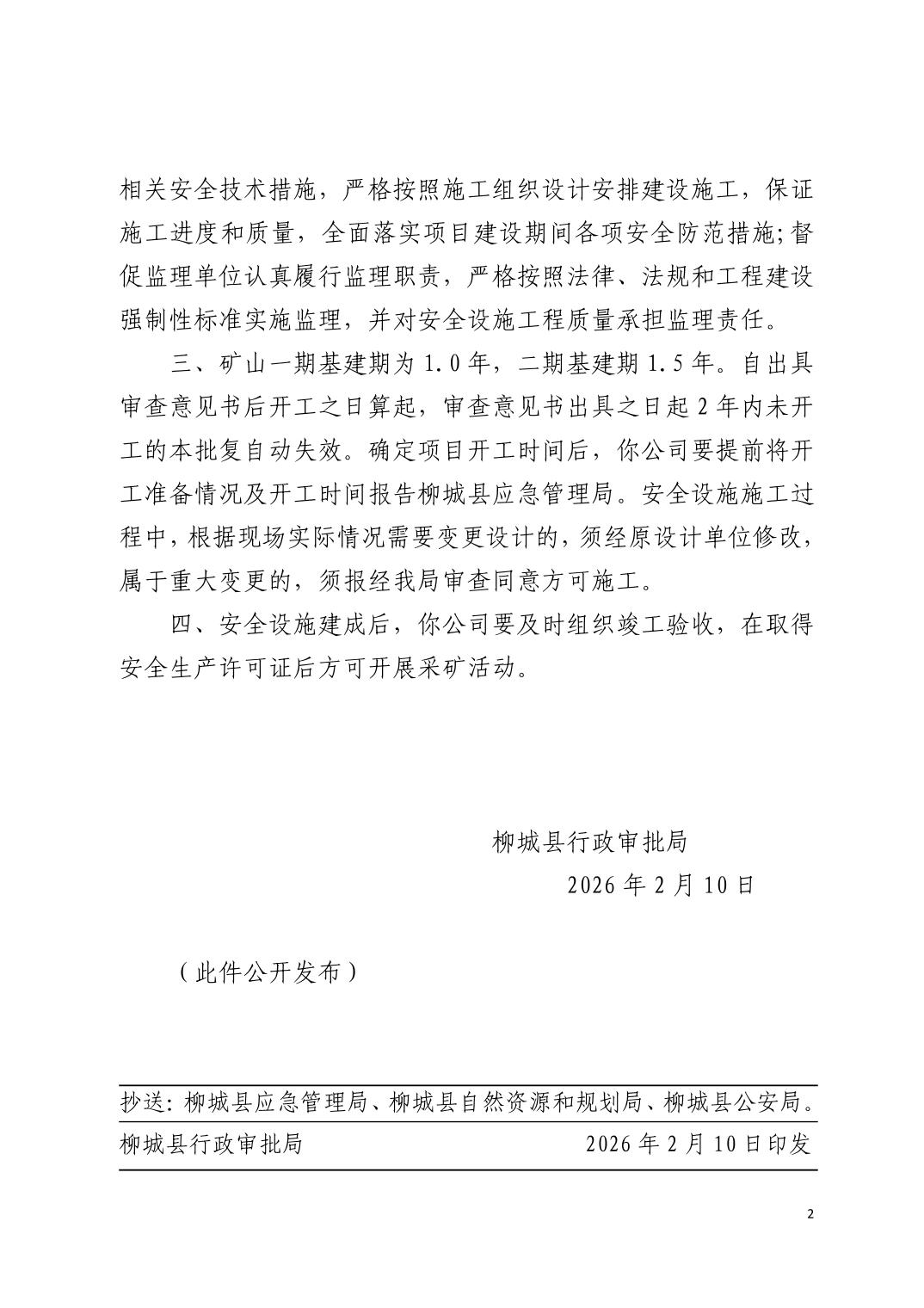 柳城县行政审批局关于柳州市柳城县社冲乡牛角山冶金用白云岩矿(190万t/a新建项目)安全设施设计审查意见书