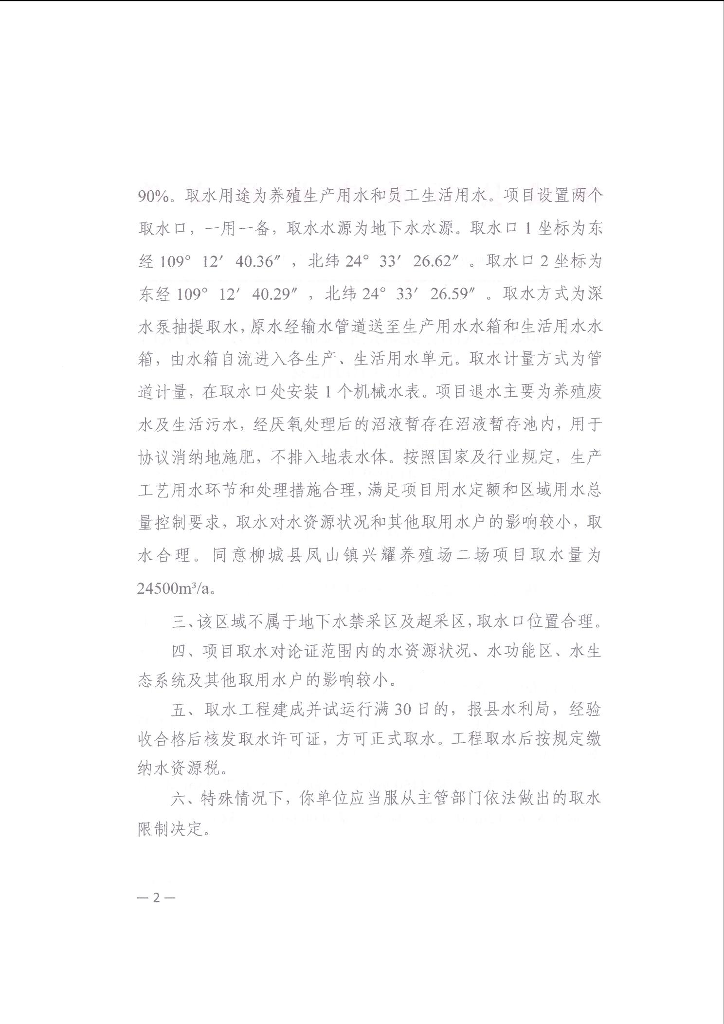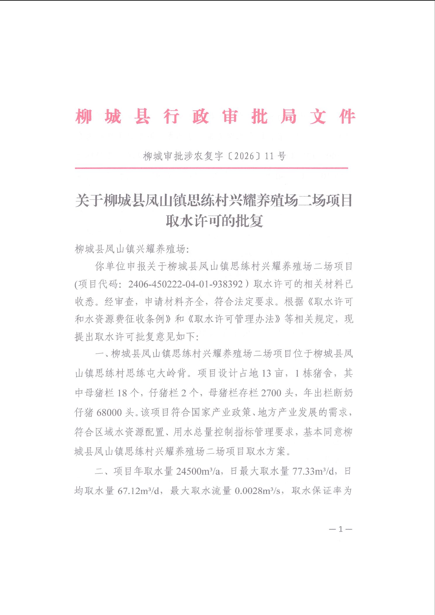 柳城县行政审批局关于柳城县凤山镇兴耀养殖场取水项目取水许可的批复