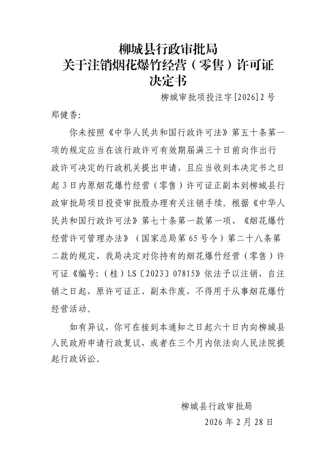 柳城县行政审批局关于注销烟花爆竹经营(零售)许可证的决定书