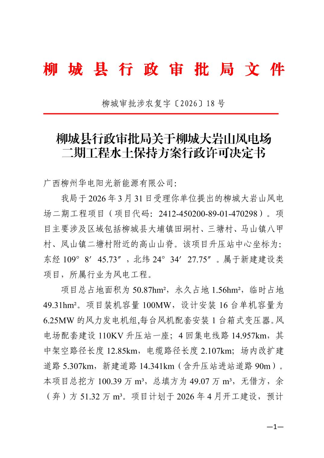 柳城县行政审批局关于柳城大岩山风电场二期工程水土保持方案行政许可决定书