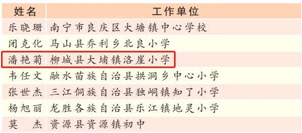 潘艳菊老师毕业于柳州市师范学校,2003年至今,先后在柳城县大埔镇勤俭小学、大埔镇洛崖小学任教。坚守在乡村学校20年,她一直从事一线的教育教学工作,把青春献给了三尺讲台,献给了她深深热爱的教育事业。