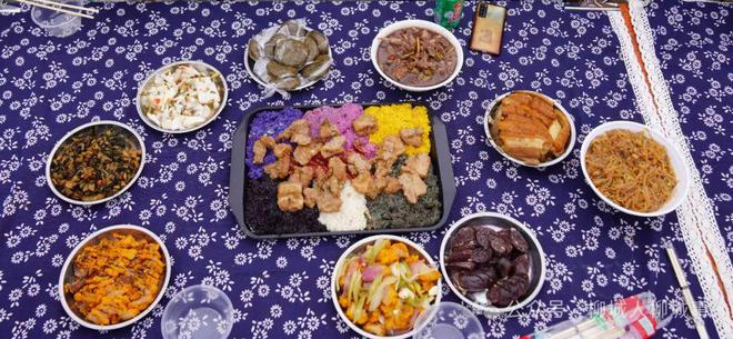 桌上菜品都由冲脉厨师团队精心制作。醋血鸭、酥皮扣肉、长山头菜、壮家血肠、小酥肉、红薯粉等菜肴令人垂涎欲滴,在百家宴上还设置山歌对唱环节,大家都唱起自己拿手的歌曲,你方唱罢,我来和,大家以歌会友,以茶传情,好不热闹!