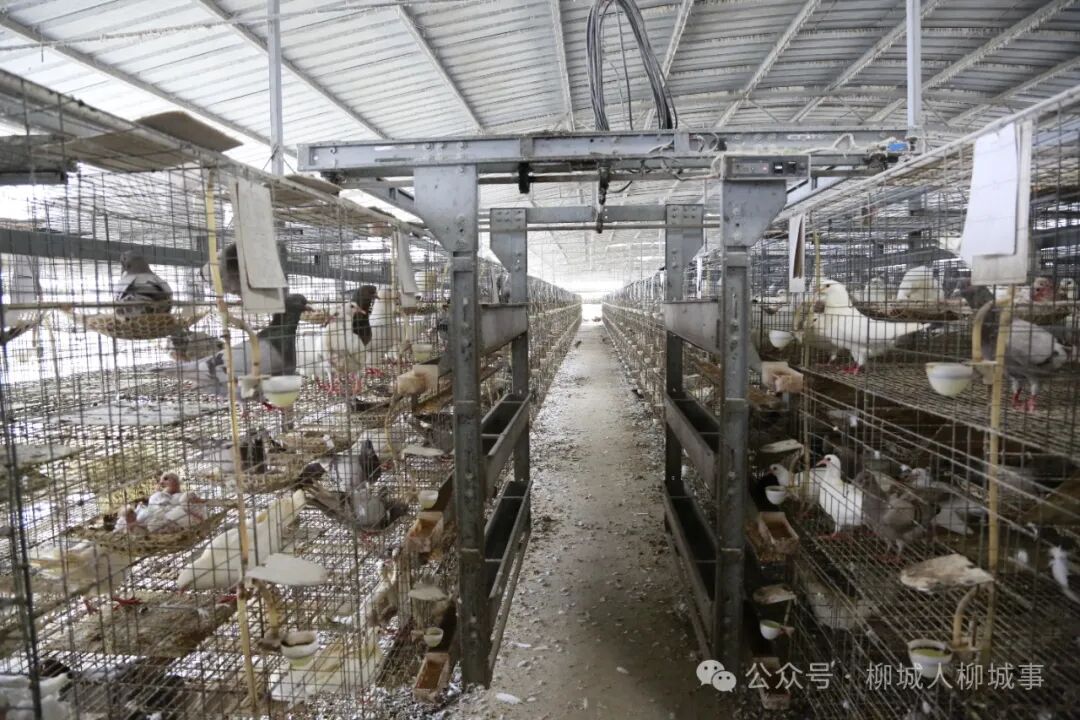 在柳城县古砦仫佬族乡肉鸽产业园5栋鸽棚内,鸽笼整齐地排列着。肉鸽成对而栖,在鸽舍内或亲昵、或啄食、或安静地孵蛋。养殖户龙杏枝和覃孝安夫妻二人一个正在捡鸽子蛋、记录产蛋日期,一个正在把食料倒进自动喂食机器里,默契忙碌着。