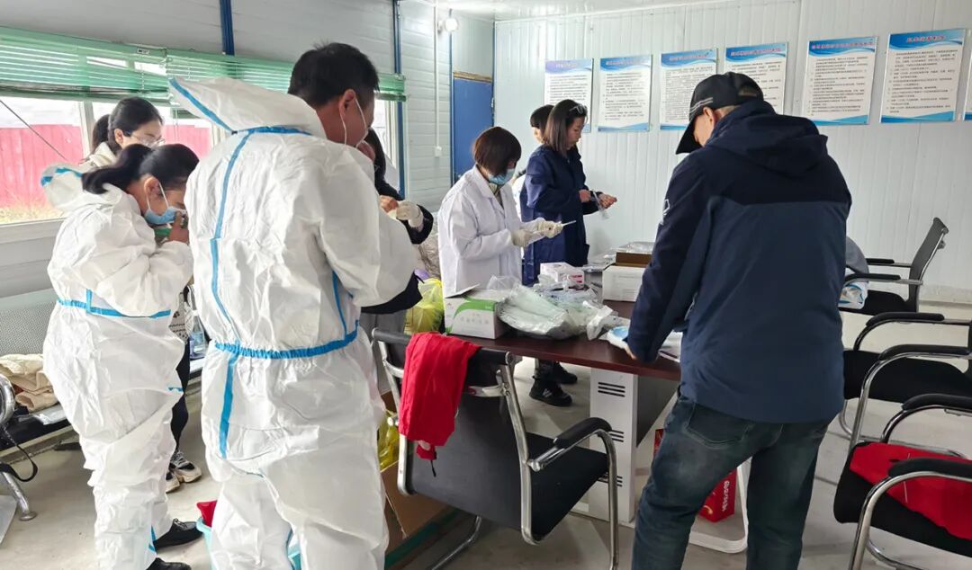 穿上防护服,戴上口罩,套上鞋套,一行人步入养殖大棚,开始工作。只见他们三五个人一组,一人负责控制羊,一人负责抽取羊的颈静脉血,一人负责保管血样。抓羊、抽血,在已取样的羊角上用粉笔画上标记,交付血样……动作娴熟而快捷,几秒钟就完成了一只羊的取样。很快,一个大棚的成年羊的取样工作完成了。