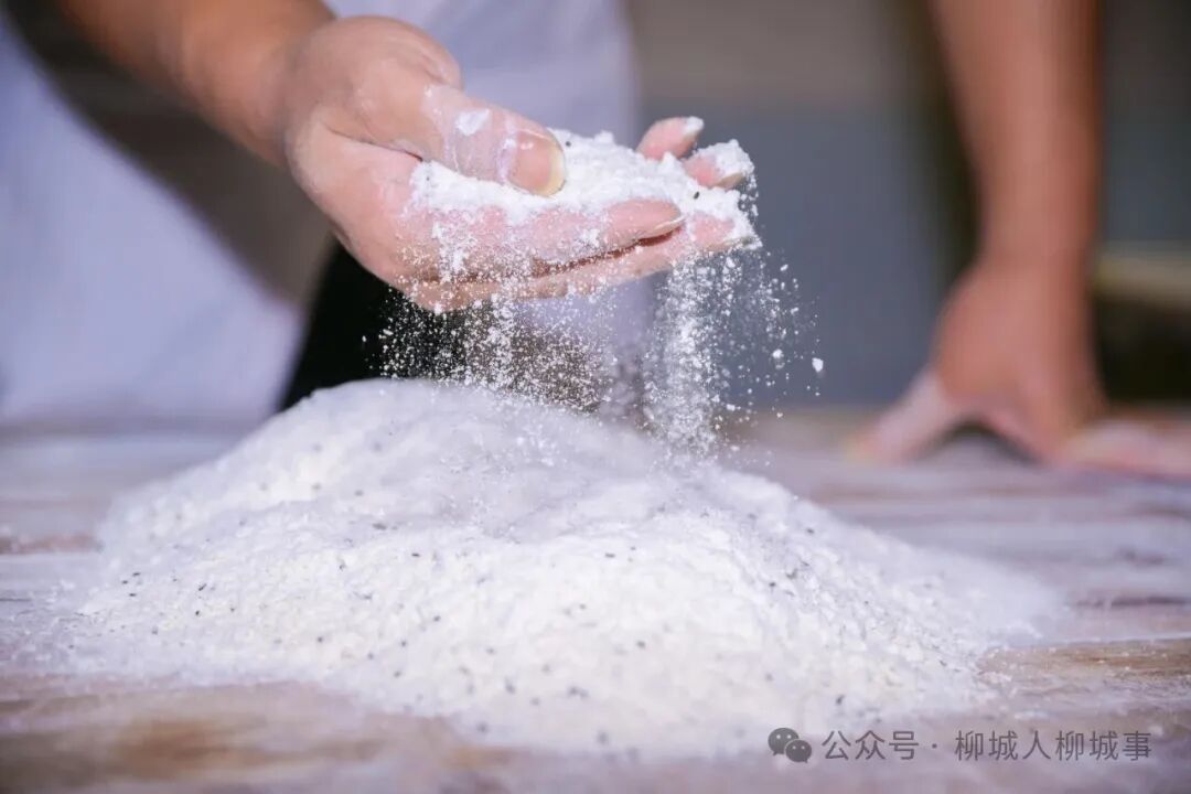 制作的精妙,全在“裹”与“压”之间。他先将糯米粉在案台堆成“窝状”,然后让稠如酸奶的糖油顺着勺沿拉丝流入米粉堆,双手呈弧形翻拌,让米粉与糖油裹成棉絮般的团状。