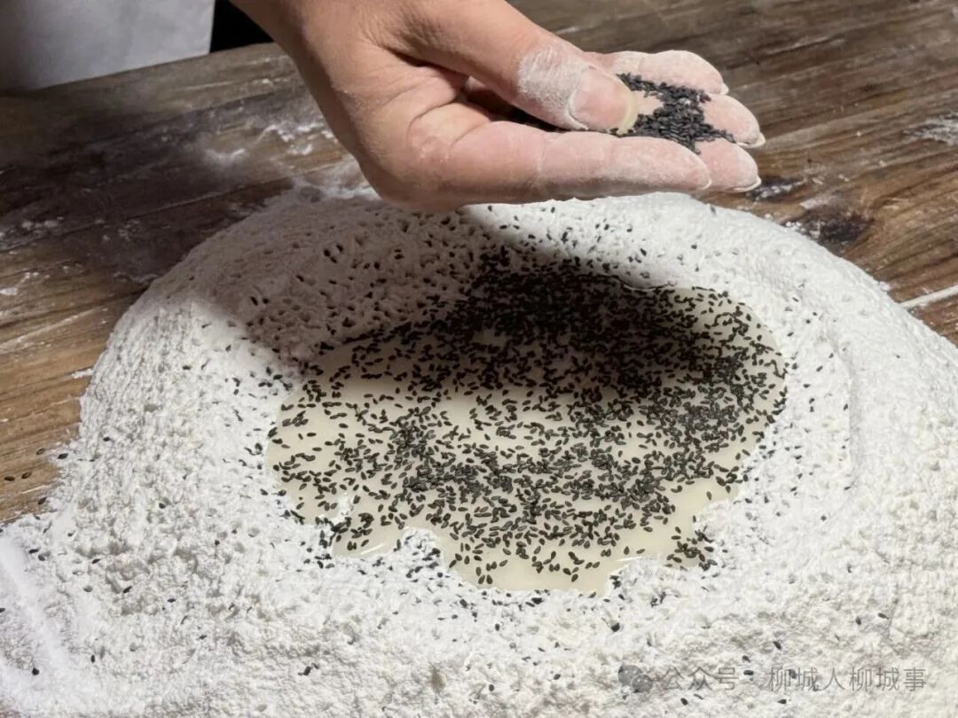 翻拌的过程中,廖荷辉拿起两把灰铁刮板,对着粉团反复切压,黑芝麻便均匀嵌进米粉里。“力道轻得像给小孩拍背似的。”他手腕转动间,粉团已泛出芝麻斑点,“要是使劲揉,米粉起了筋,米饼咬着就发死,没那股松软劲儿了。”廖荷辉说,他这手“轻压慢拌”的功夫,是跟着母亲学手艺时最磨人的一课。“那时候我总急着出活,母亲就拿木棰敲我手背:‘米饼是吃香的,不是吃力气的’。”