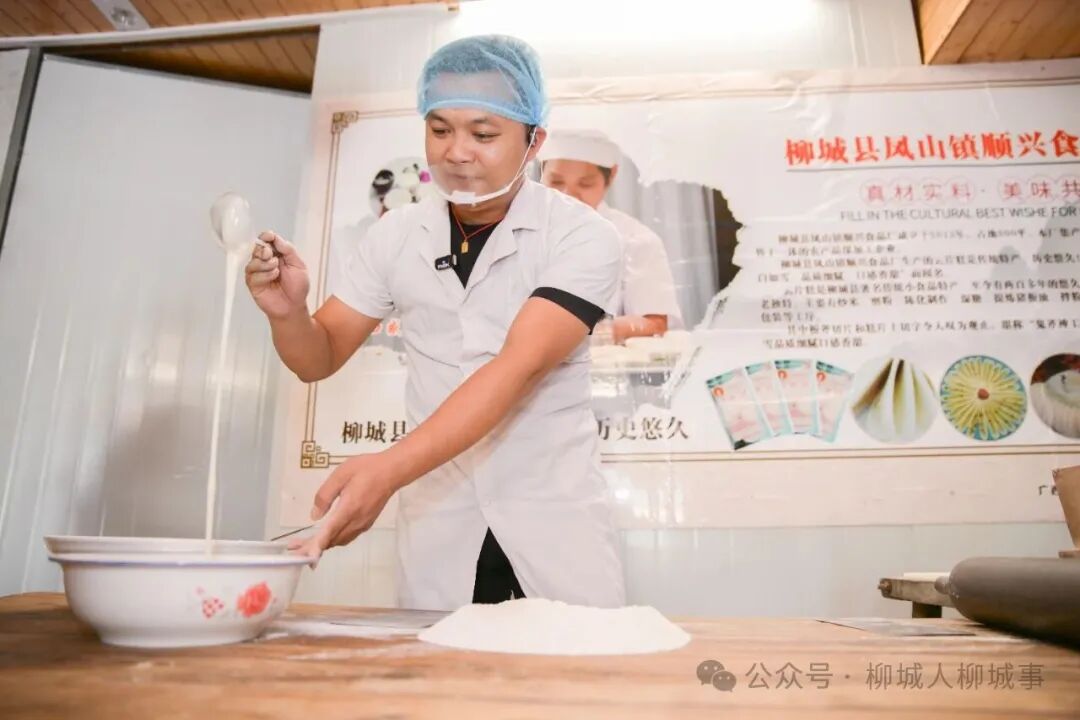 柳城县凤山镇顺兴食品厂的木案台上,一捧雪白的糯米粉堆成小丘,廖荷辉指尖轻捻,将炒香的黑芝麻均匀撒在米粉的中央——这是“柳城十大金牌名小吃”米饼的第一步,也是柳城人记忆里最熟悉的甜香开端。作为柳州市级非遗传承人,廖荷辉把家族几代人的手艺,揉进了一枚小小的米饼里。