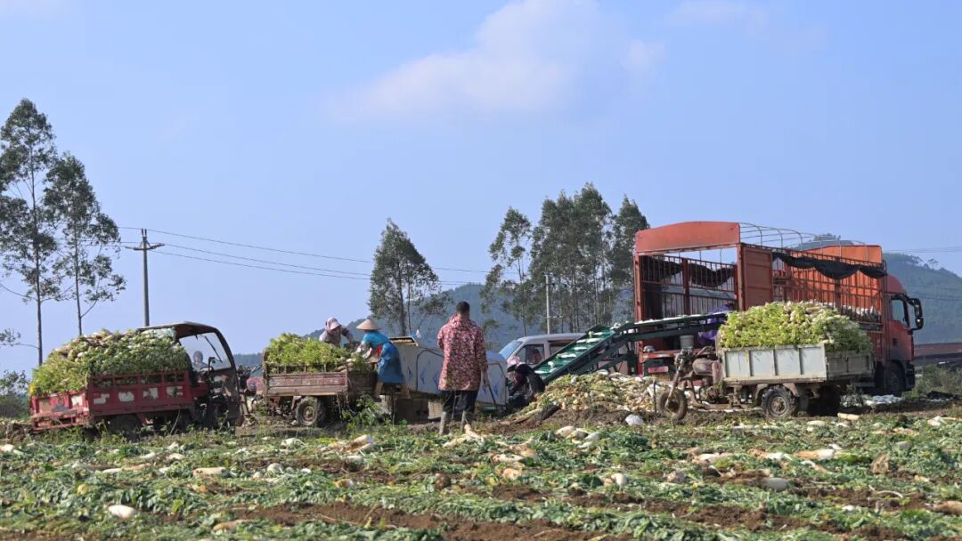 12月,柳城县马山镇四塘农场三队的田野里一派繁忙景象。460 多亩白萝卜田郁郁葱葱,翠绿的菜叶下,一个个饱满雪白的萝卜破土而出,预示着今年的大丰收。眼下正是采收旺季,种植户杨吉雄忙着采收。