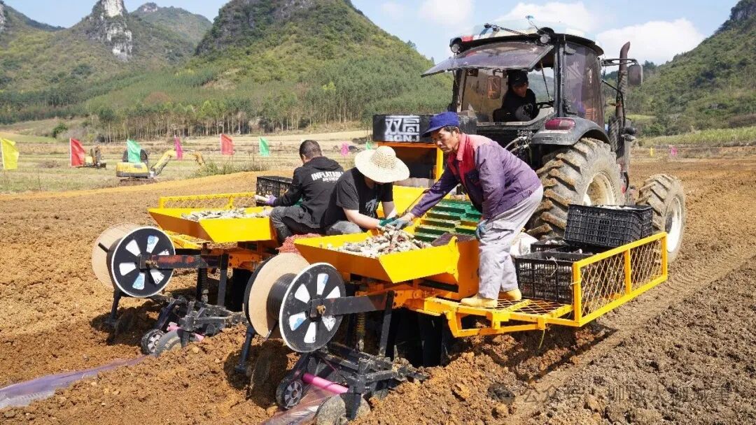 在实地观摩环节,与会人员移步示范基地,近距离感受现代农业机械的“硬核”实力。只见大马力拖拉机牵引深松犁在田间往返穿梭,大型甘蔗种植机轰鸣作业,开沟、下种、覆土、镇压一气呵成,展现了机械化作业的高效与精准。