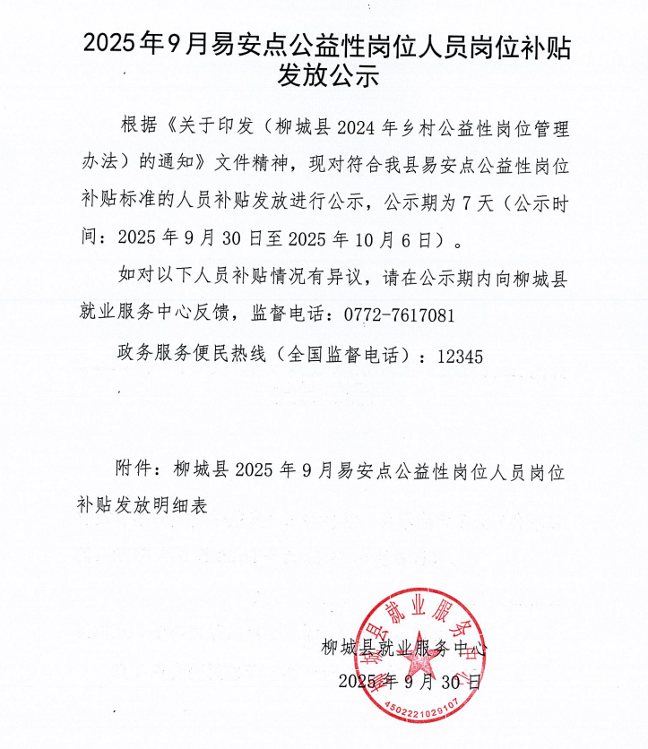 2025年9月易安点公益性岗位人员岗位补贴发放公示