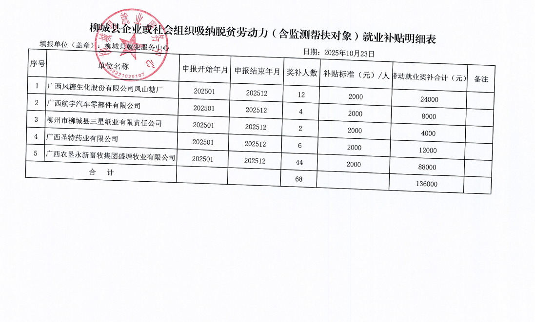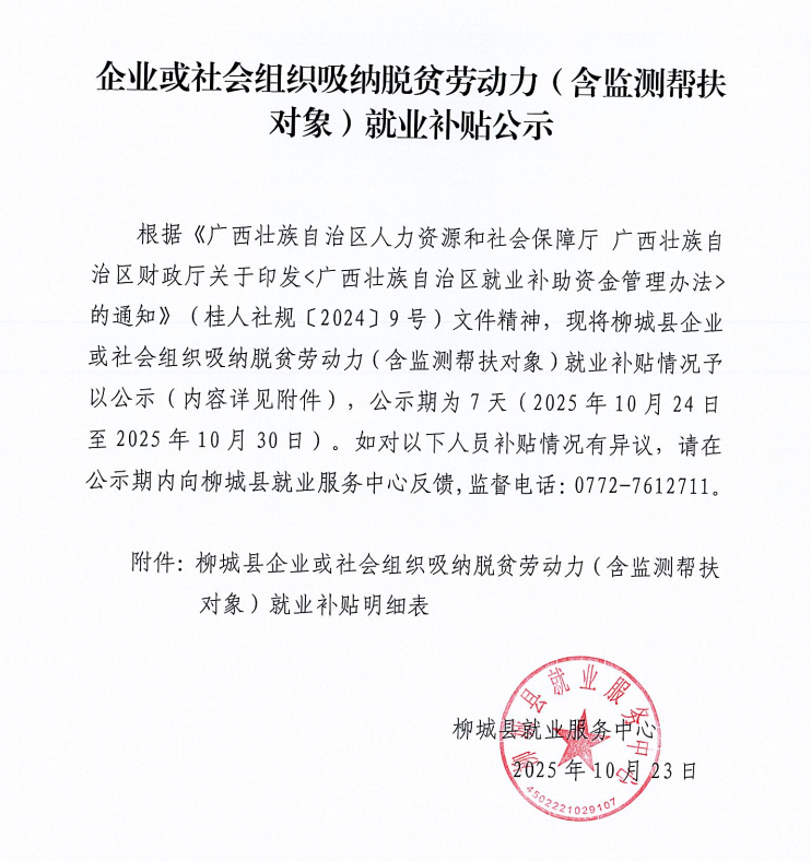 企业或社会组织吸纳脱贫劳动力(含监测帮扶对象)社保补贴公示