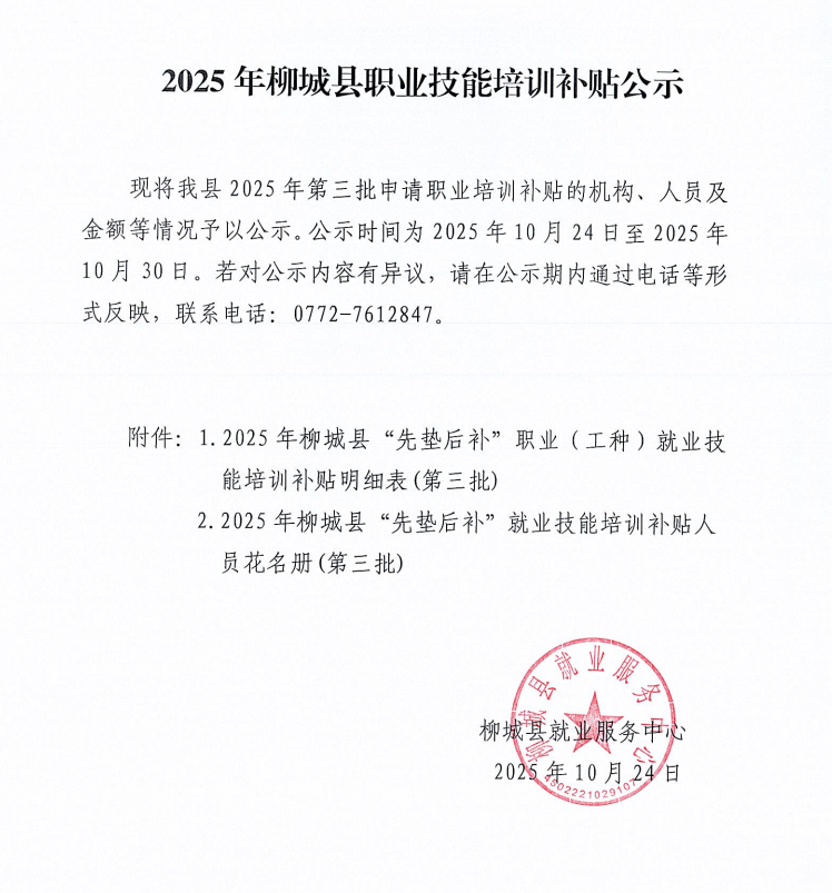 2025年柳城县职业技能培训补贴公示(356人619974元)