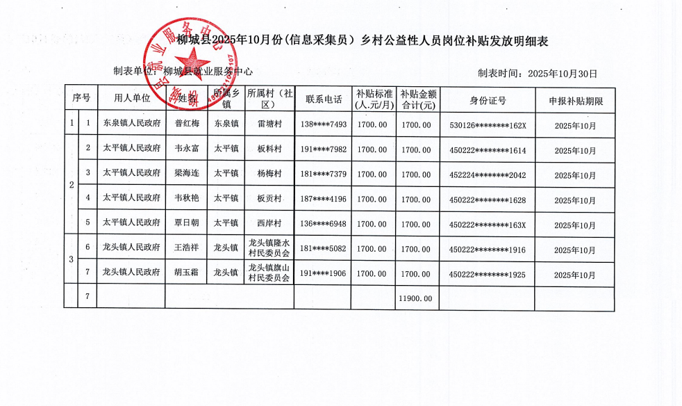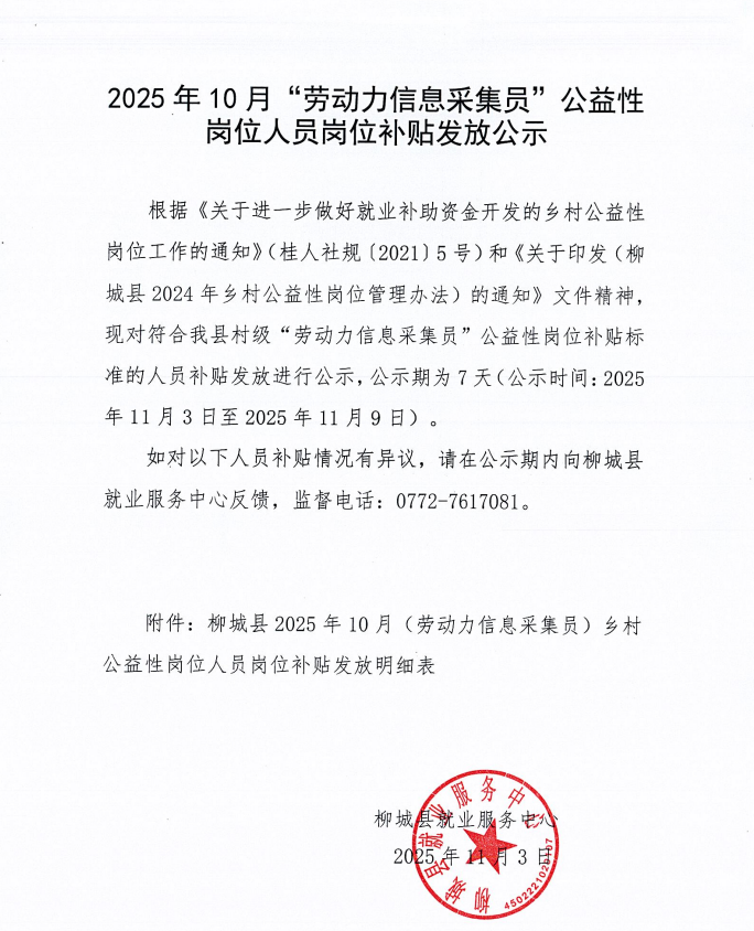 2025年10月劳动力信息采集员公益性岗位人员岗位补贴发放公示