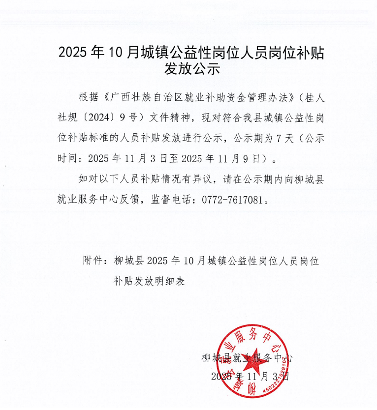2025年10月城镇公益性岗位人员岗位补贴补贴发放公示