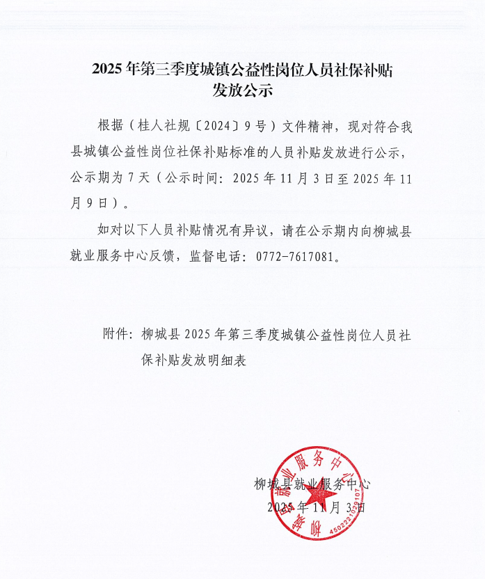 2025年第三季度城镇公益性岗位人员社保补贴发放公示