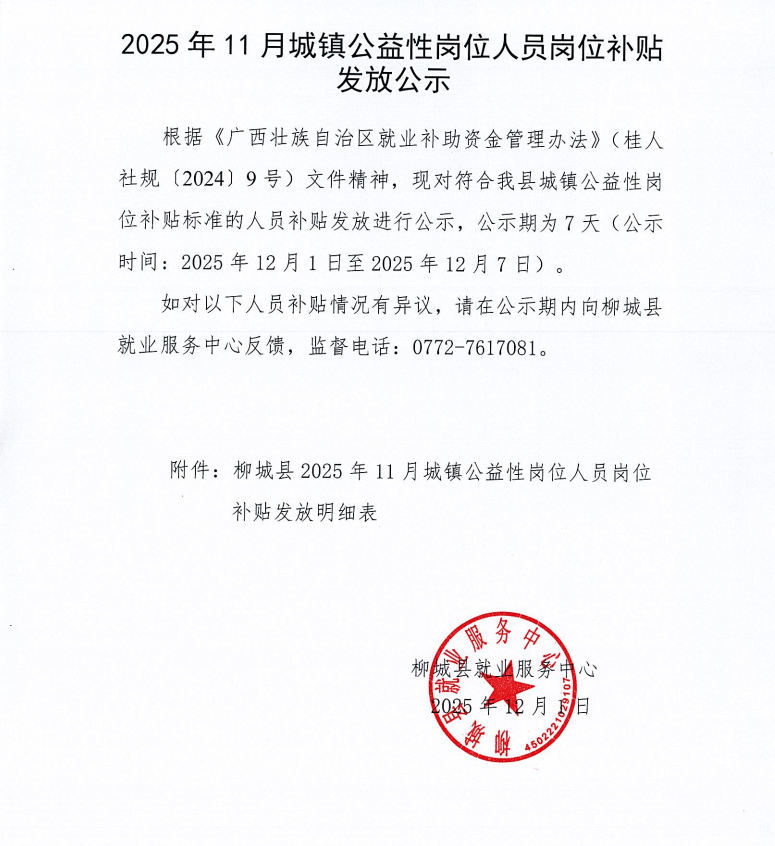 2025年11月城镇公益性岗位人员岗位补贴发放公示