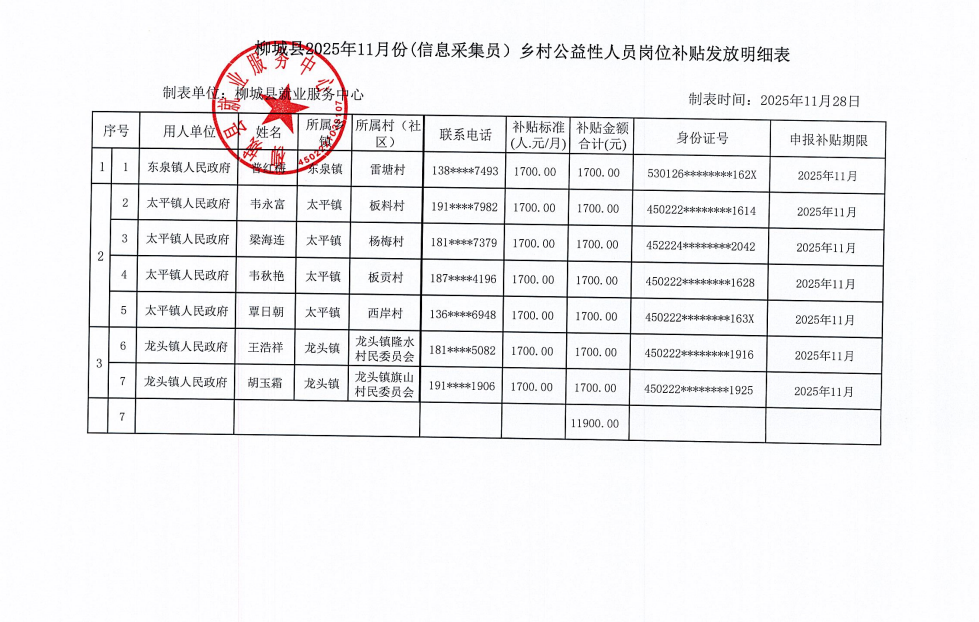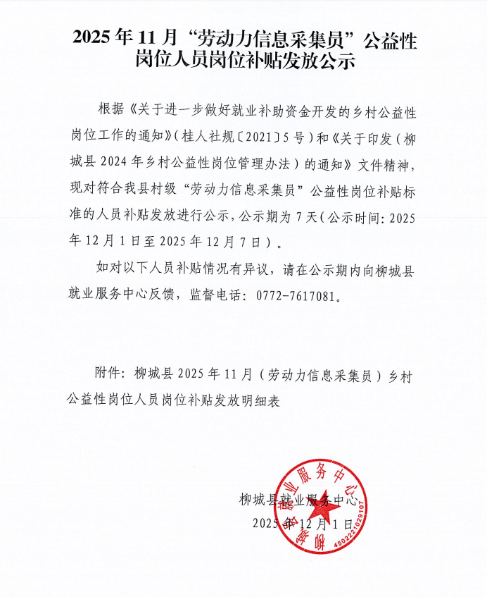 2025年11月劳动力信息采集员公益性岗位补贴发放公示