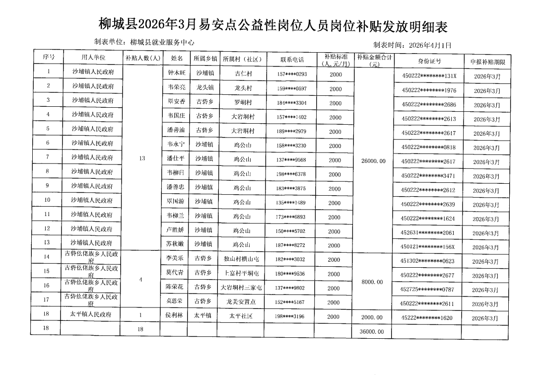 2026年3月易安点公益性岗位人员岗位补贴发放公示