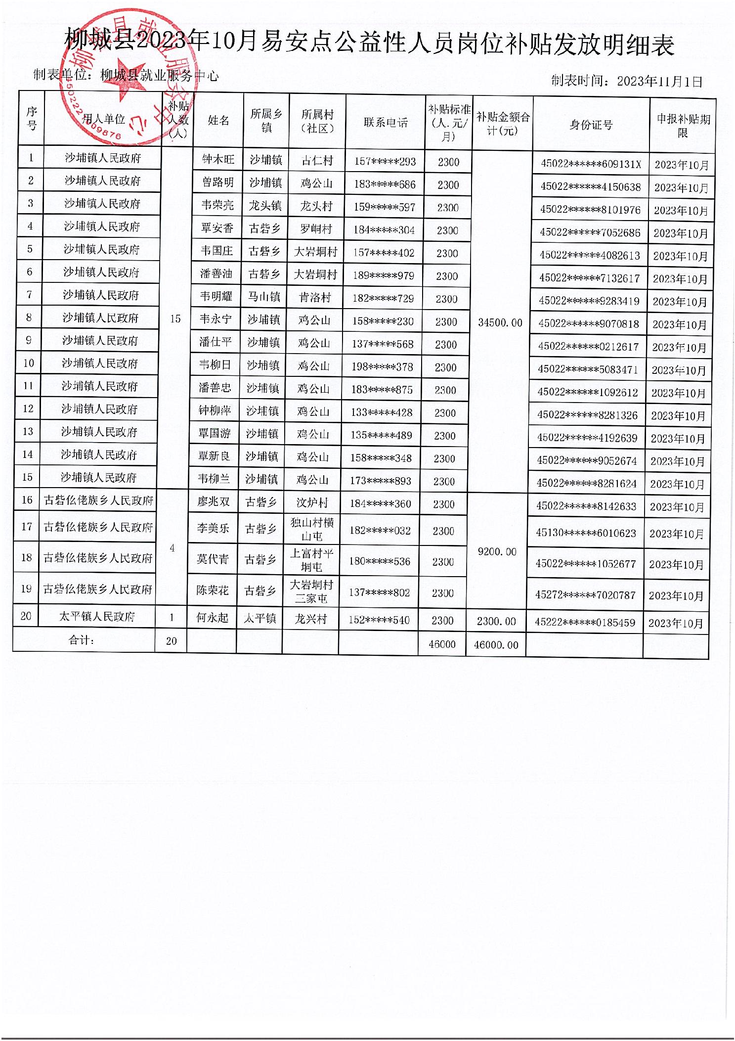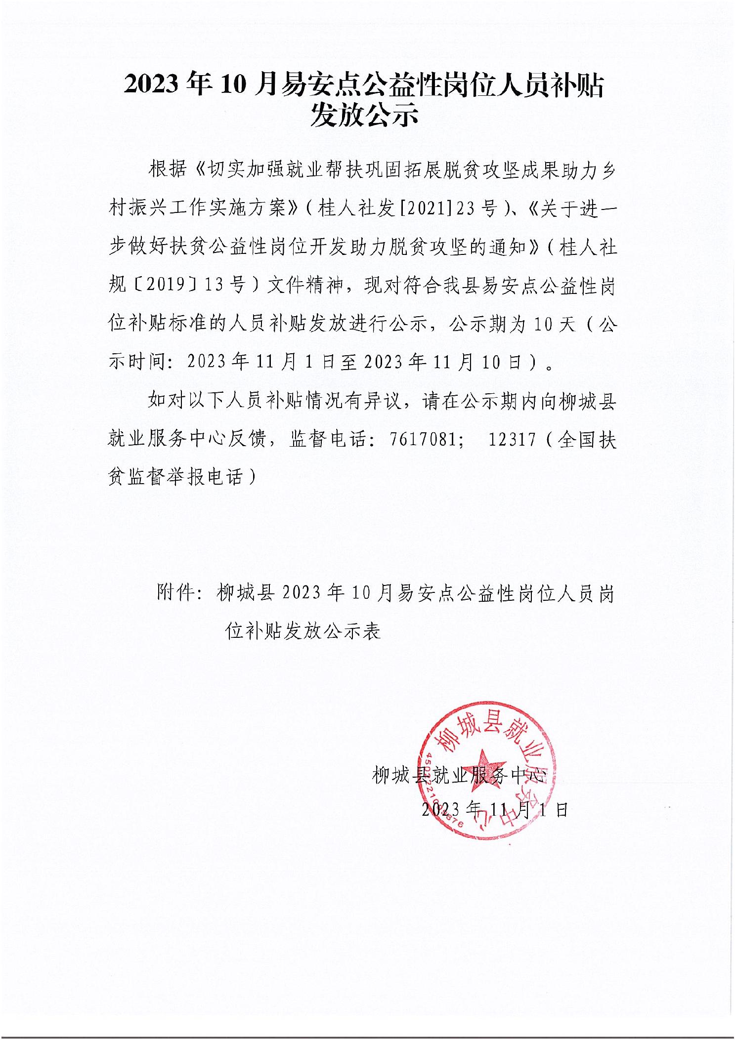 2023年10月易安点公益性岗位人员补贴发放公示