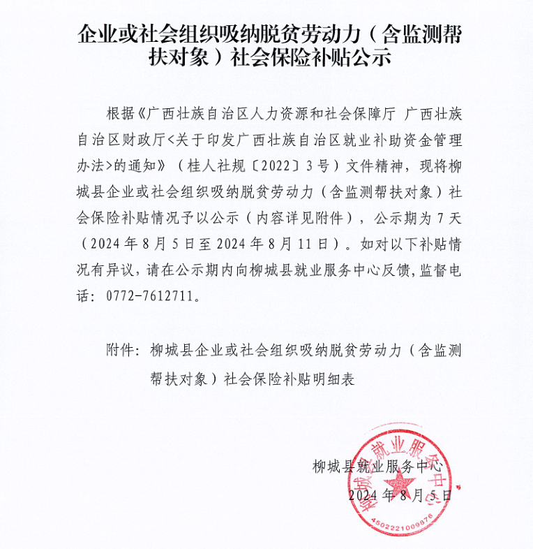 企业或社会组织吸纳脱贫劳动力(含监测帮扶对象)社会保险补贴公示