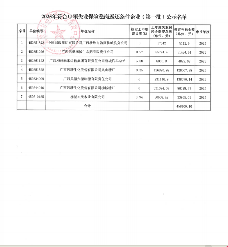 为更好地发挥失业保险预防失业、促进就业作用,激励企业承担稳定就业的社会责任,根据《广西壮族自治区人力资源和社会保障厅 广西壮族自治区财政厅 国家税务总局广西壮族自治区税务局关于延续实施失业保险稳岗惠民政策措施的通知》(桂人社发〔2025〕19号)等规定,经审核,现对符合申领失业保险稳岗返还条件的7家企业名单(详见附件)予以公示。公示期为7天,即从2025年9月19日至2025年9月25日。请企业将稳岗返还资金用于职工生活补助、缴纳社会保险费、转岗培训、技能提升培训等稳定就业岗位以及降低生产经营成本支出。